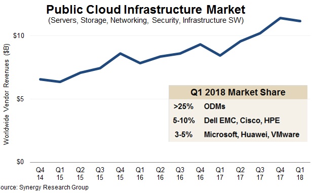 根据Synergy Research的新数据,2018年第一季度公共云提供商在基础设施硬件和软件方面的支出继续激增,和2017年第一季度比增长32%。这是9个季度以来增长率最高的,一般增长率在10-20%。第一季度通常会在第四季度强劲增长后出现大幅下滑,但今年第一季度支出仅比第四季度下降2%。