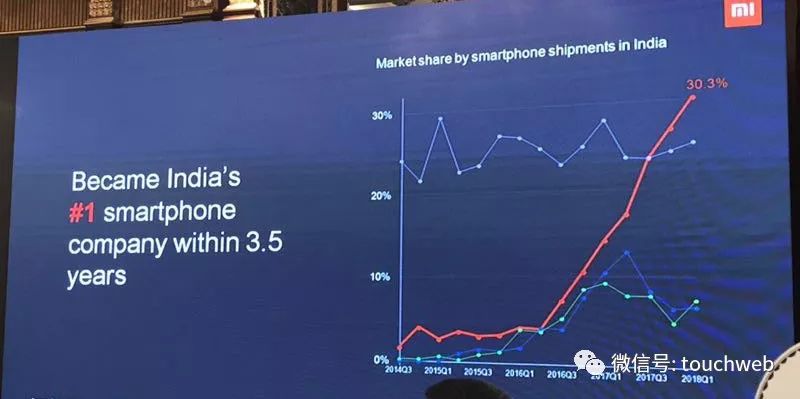 小米2018年第一季度在印度手机市场的份额超过30%,已连续3个季度第一,现在还在快速成长之中。