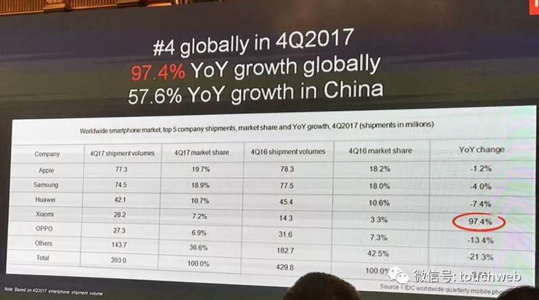 2017年第四季度,苹果、三星、华为负增长,小米重回世界第四。小米在2018年第一季度继续高速成长。