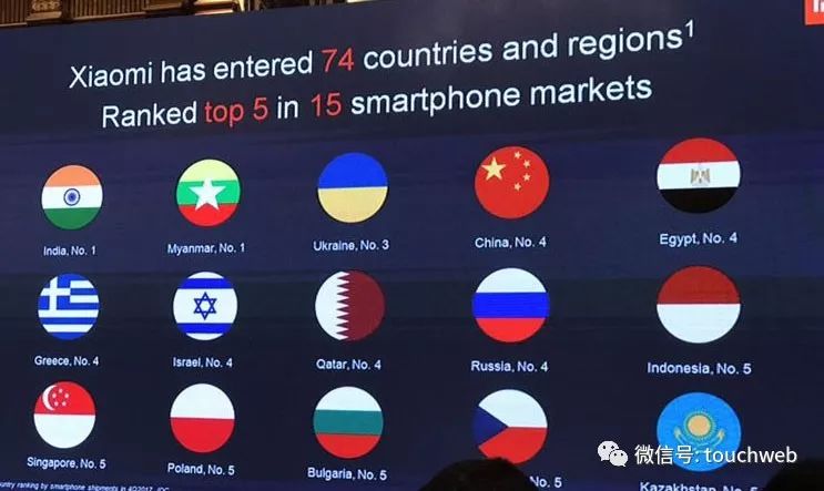 除了印度市场之外,小米过去一年多还去了70多个国家,到2018年第一季度,小米已经在20个国家进入到市场前五。