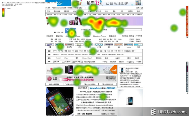 我们通常用热图(heat map)来表示界面的被注视情况(如下图)。越红的区域,表明注视的时间比较长,绿色的区域,表面注视的时间较短,当然,白色的区域用户根本就没有看到。