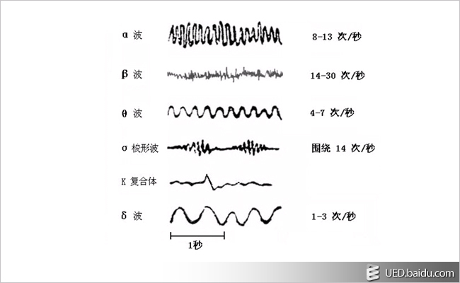 脑电(EEG)是由于大脑中大量神经组织的突触后电位同步总和而成,含有大量的心理信息,以不同的波形反映出来,常见的波形如下图所示。