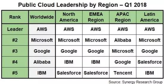 美国市场研究机构Synergy Research Group发布了2018年一季度全球主要地区公有云厂商排名。