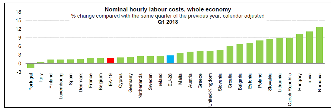 从成员国来看,2018年第一季度罗马尼亚人工成本增长最多(+12.7%),其次是拉脱维亚(+11.2%)和匈牙利(+10.3%)。葡萄牙的人工成本则下降1.5%。