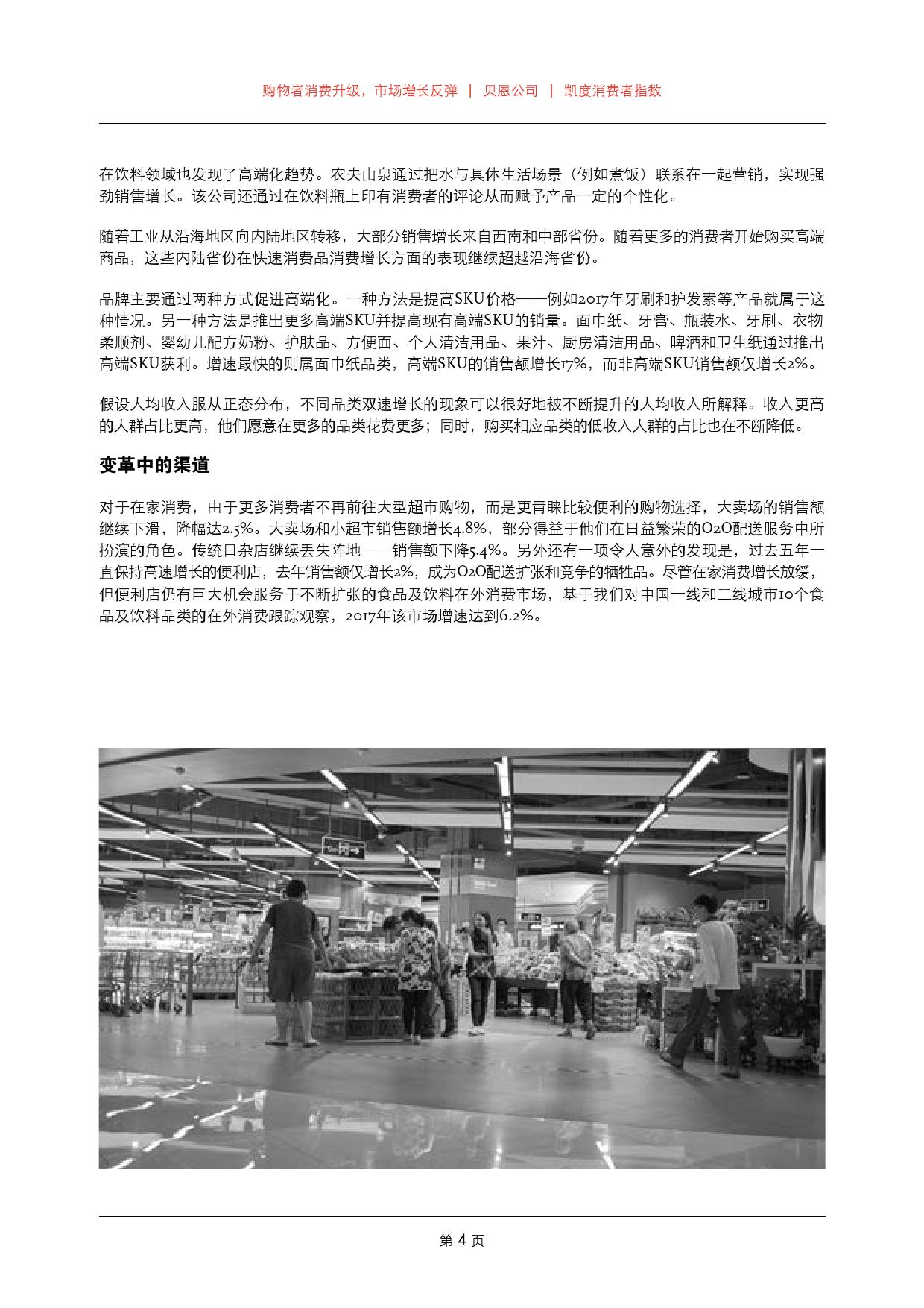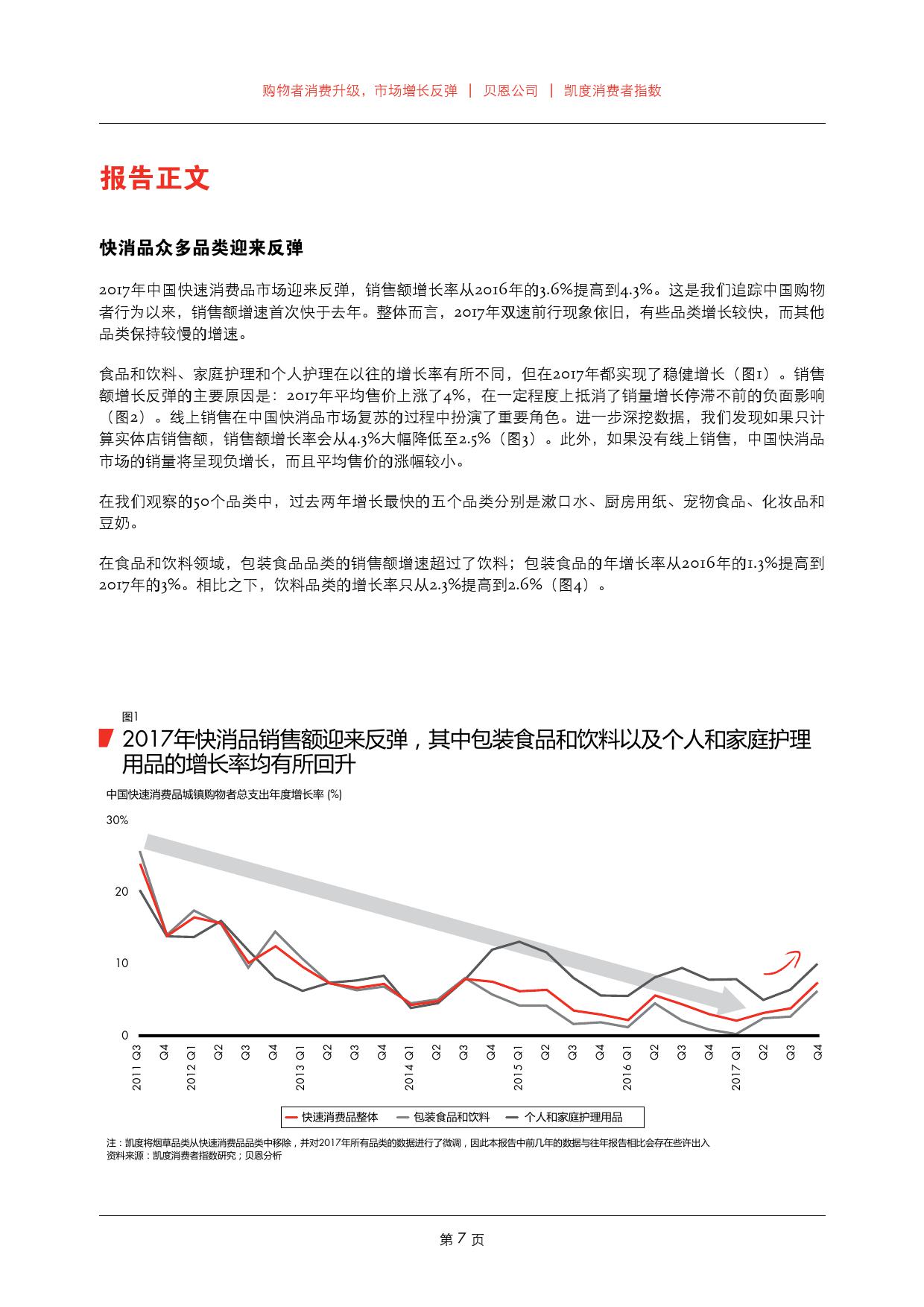 随着不断壮大的中产阶级消费者群体越来越注重提升健康水平和生活品质,中国快速消费品市场在2017年出现反弹。贝恩公司与凯度消费者指数今日发布的2018年中国购物者报告系列一《购物者消费升级,市场增长反弹》显示,2017年中国消费品市场总销售额增长率从2016年的3.6%升至2017年的4.3%,这是自该系列报告从2012年开始跟踪中国购物者行为以来,销售额增速首次超过上一年。