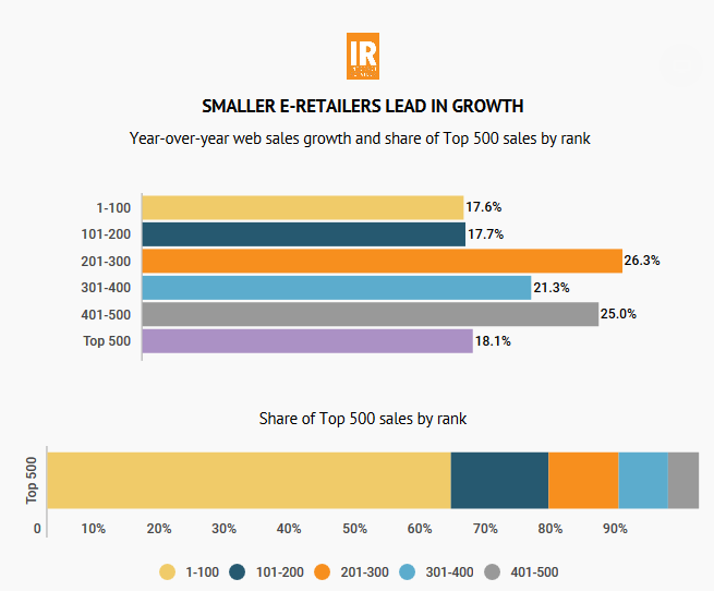 2017年,500强零售商中的前100名所占份额为85.5%,而2016年是85.9%。而快速增长的则是小型的电子商务初创企业。例如,排名201-500的零售商2017年网络销售额增长25.5%,明显快于1-200名(16.6%)。