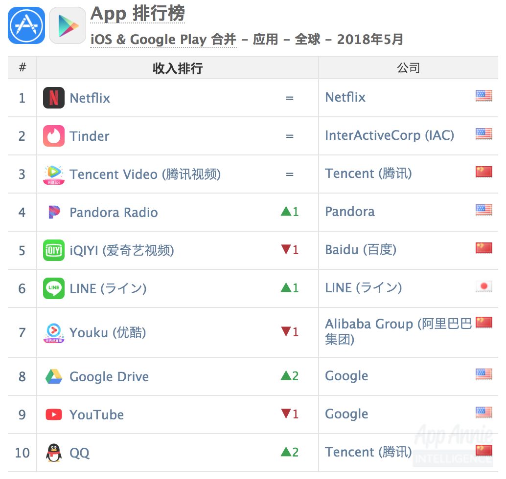 ⬇️ 2018 年 5 月全球 iOS + Google Play 综合非游戏类 App 收入榜单