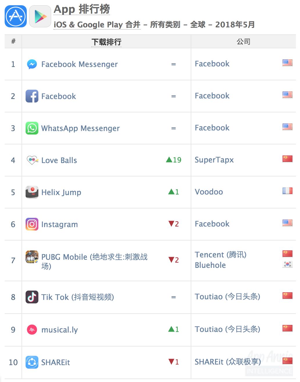 ⬇️ 2018 年 5 月全球 iOS + Google Play 综合下载量榜单