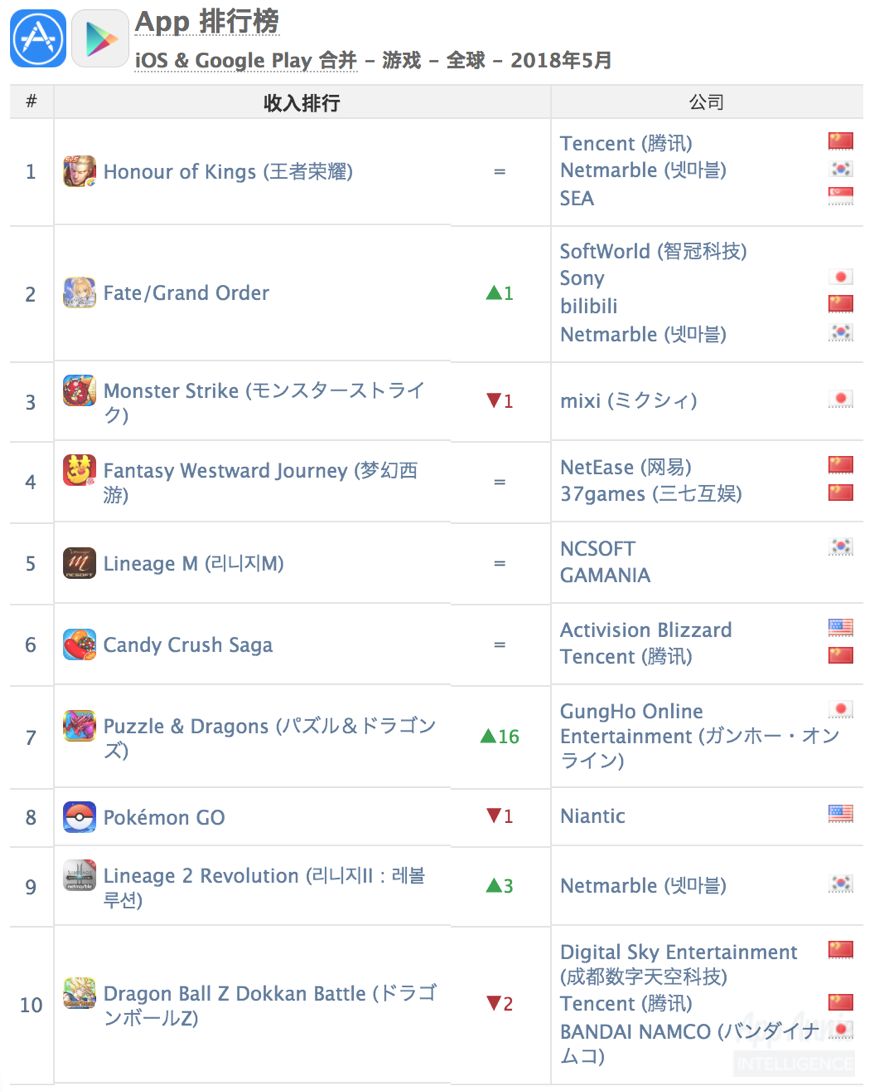 ⬇️ 2018 年 5 月全球 iOS + Google Play 综合游戏收入榜单