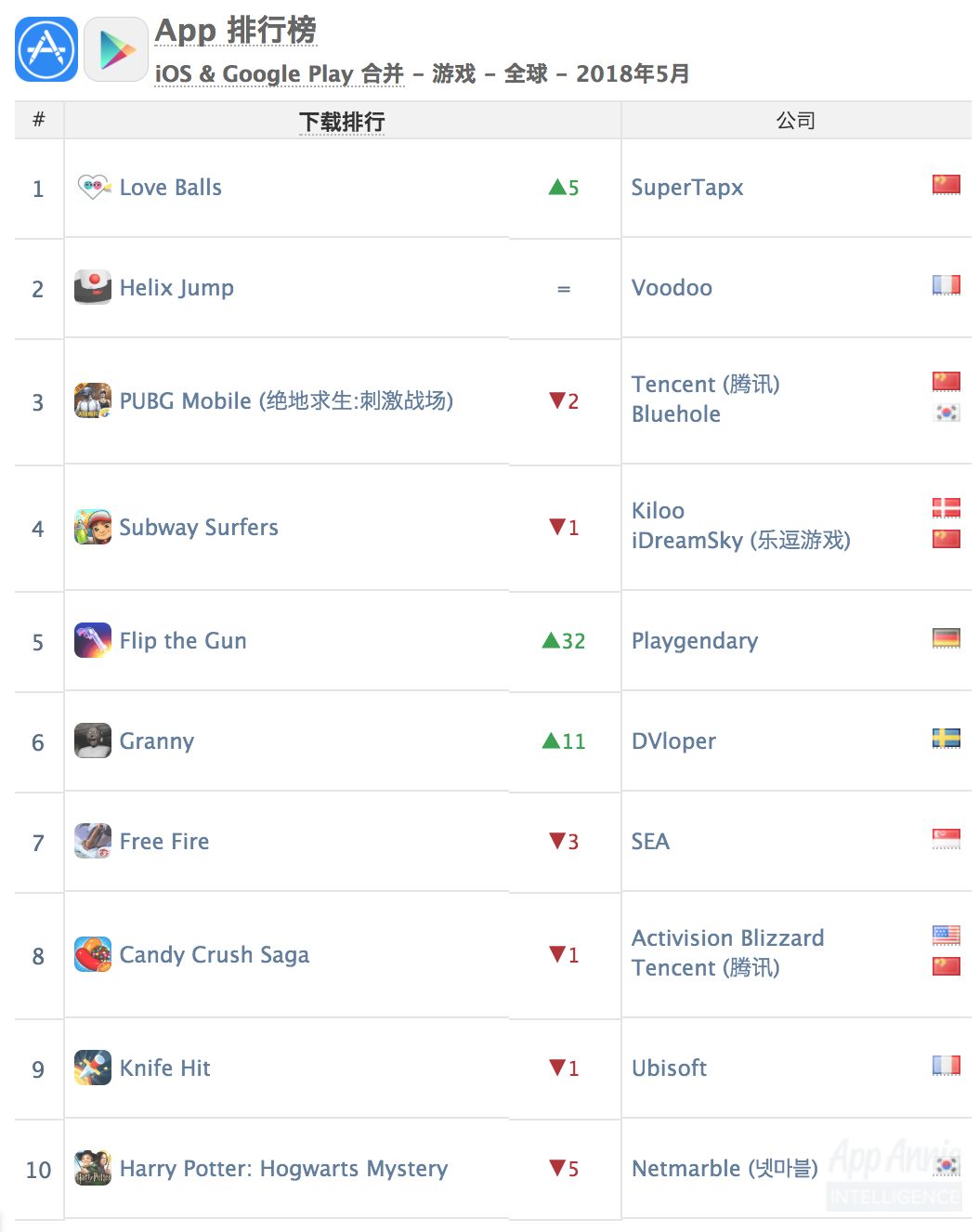 ⬇️ 2018 年 5 月全球 iOS + Google Play 综合游戏下载量榜单