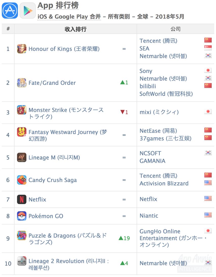 ⬇️ 2018 年 5 月全球 iOS + Google Play 综合收入榜单