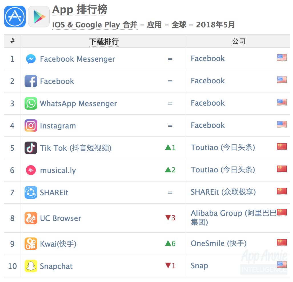 ⬇️ 2018 年 5 月全球 iOS + Google Play 综合非游戏类 App 下载量榜单