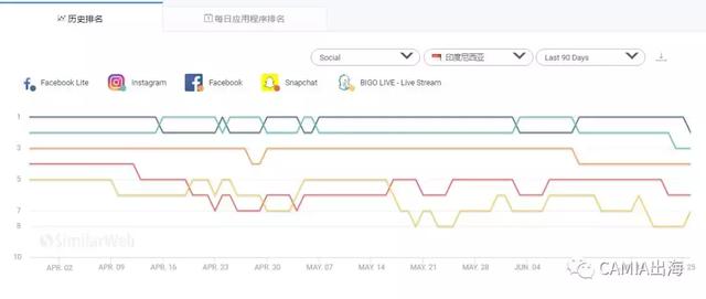 同是Facebook旗下产品,相对于《Facebook》,用户对Lite版本似乎有更大的偏好。值得注意的是,该类别的TOP 5榜中还出现了一款直播应用《BIGO LIVE》。