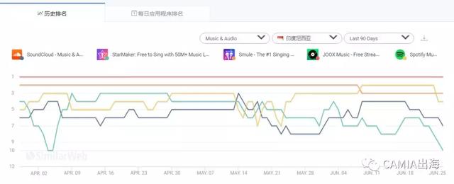 在音乐与音频类别中,获得最高人气app为“卡拉OK”《Smule》,该应用长期以来一直霸占此类应用榜单榜首位置。位列第二的《JOOX Music》一直以来也比较稳定,只不过近期被平时不算太稳定,位列第三的竞争对手《Spotify Music》有所超越。