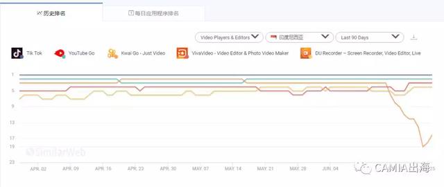 视频播放和编辑类应用排行相对比较稳定。其中短视频应用抖音海外《Tik Tok》是该类别榜单榜首最大霸主。同样是短视频类应用的快手国际《Kwai Go》和小影海外《VivaVideo》也以本期第三、第四位的成绩出现在TOP 5榜单中。