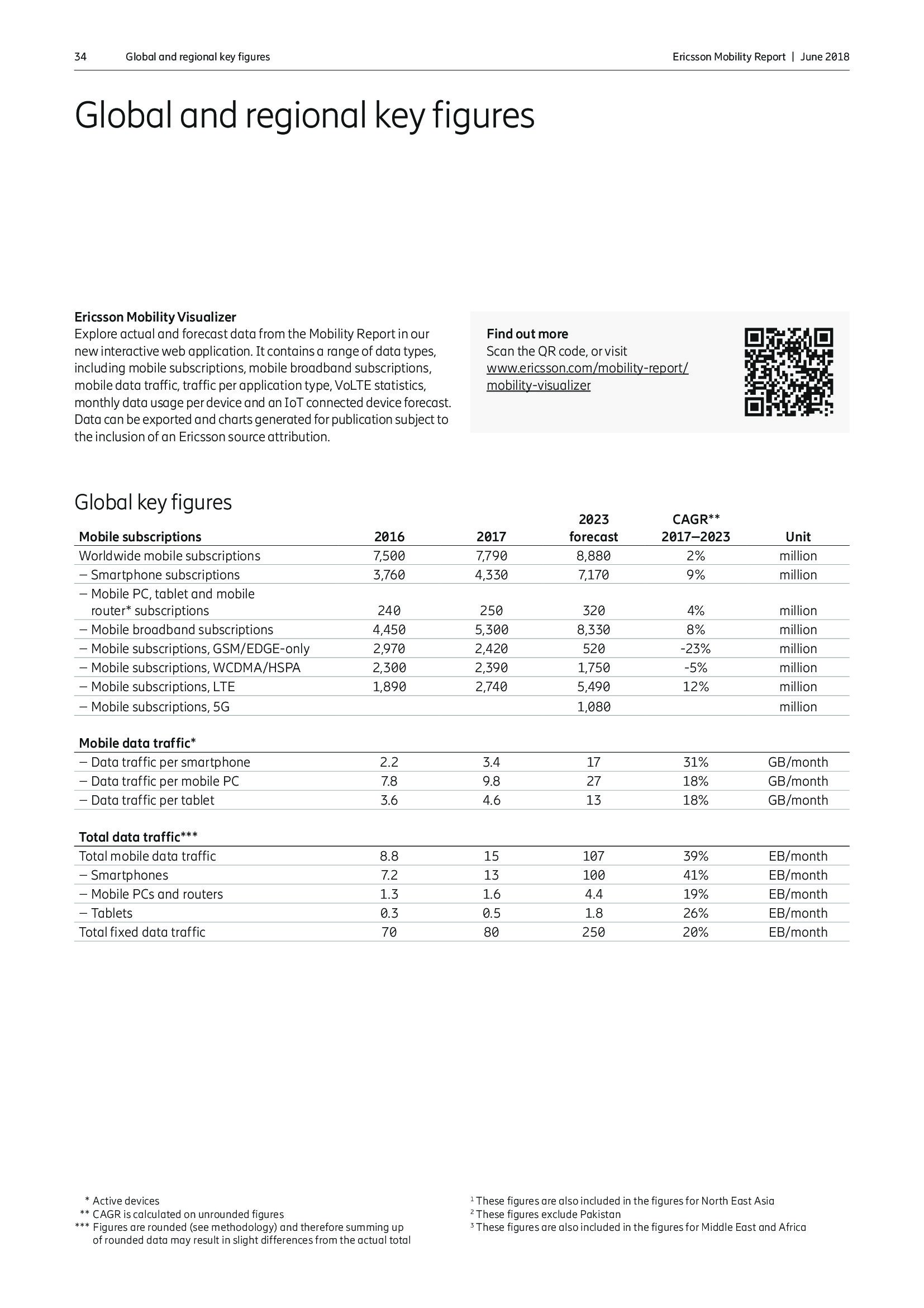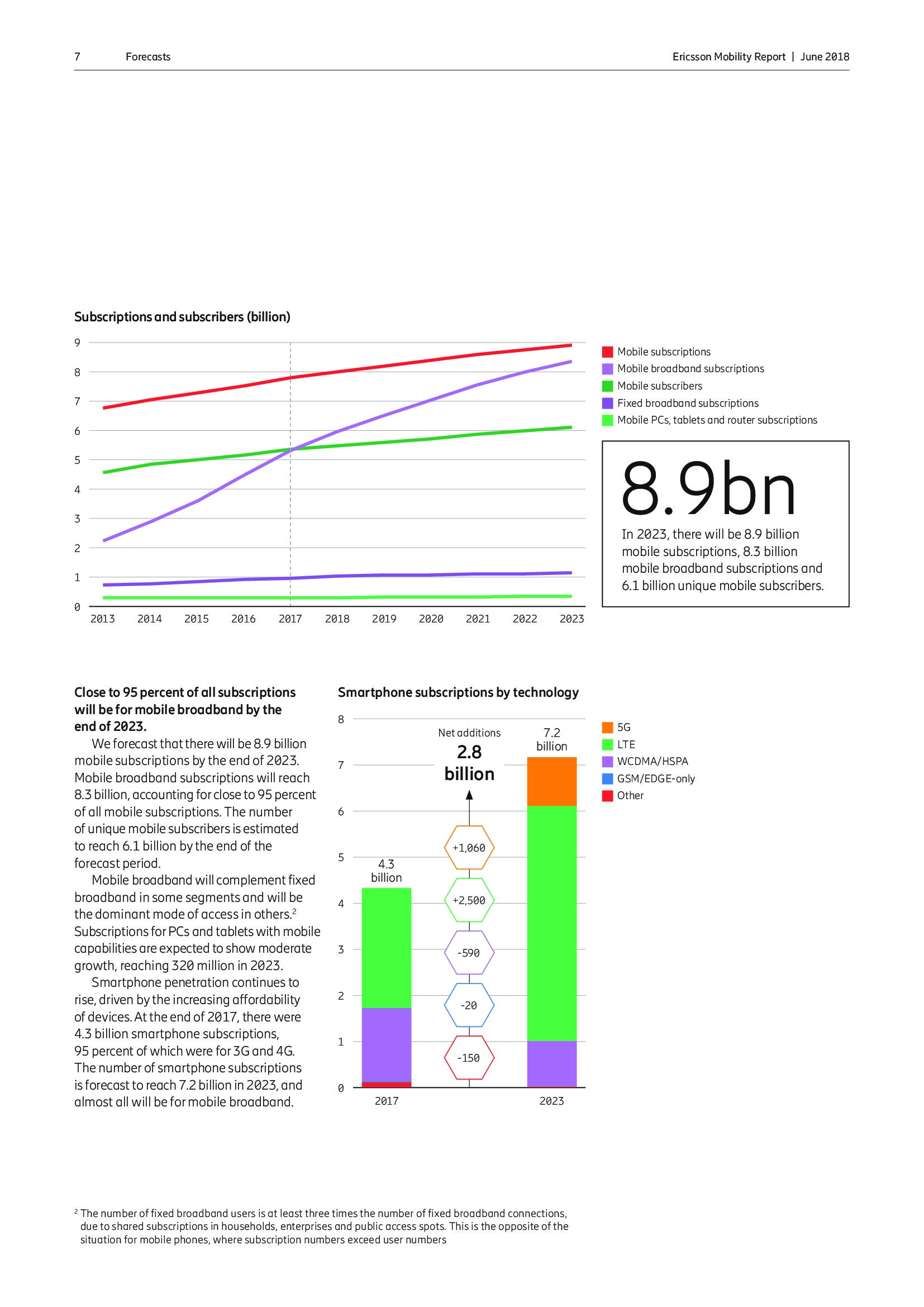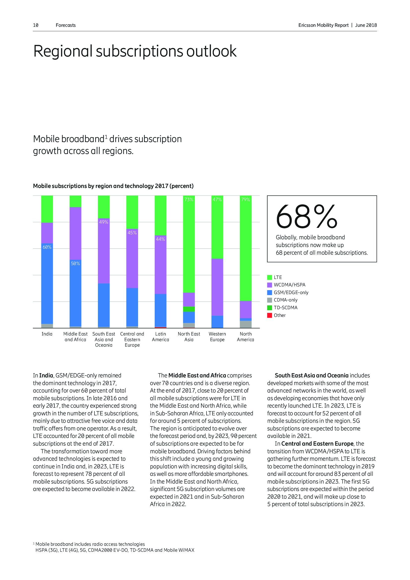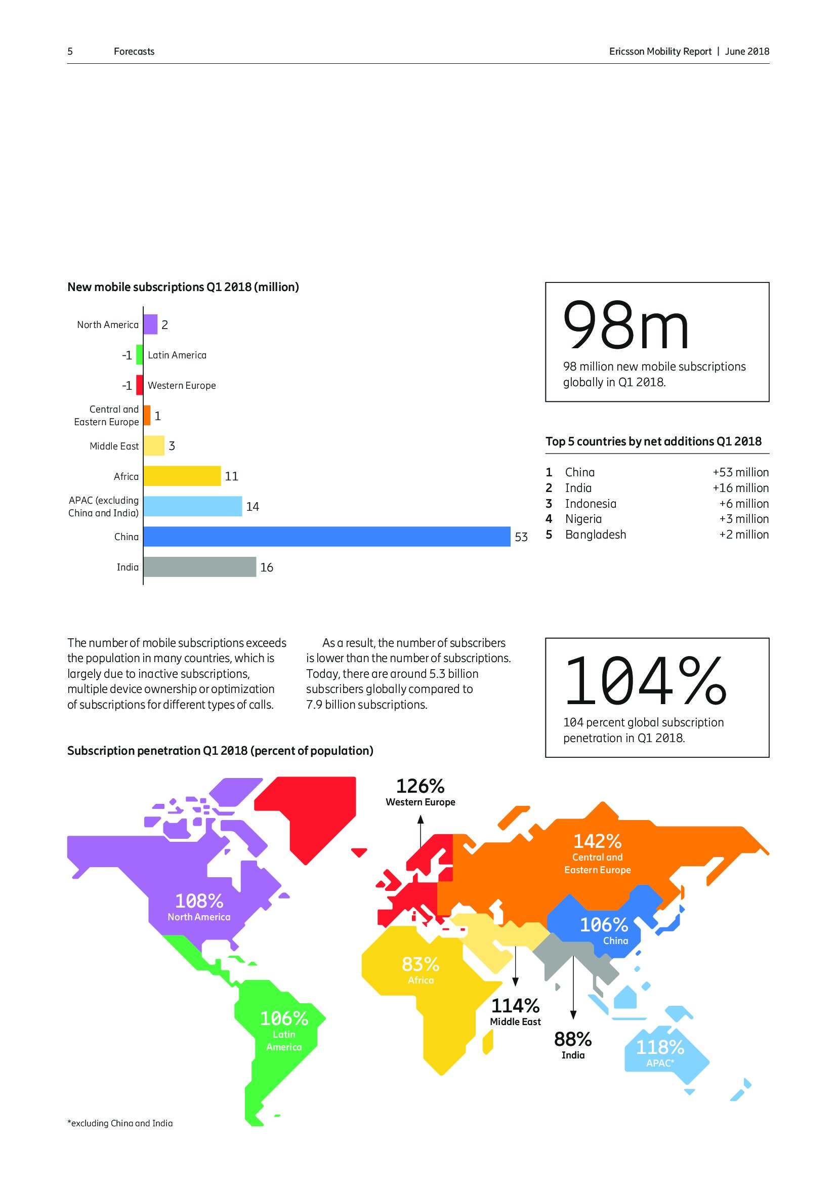 Ericsson发布了最新的“移动报告”。 2018年第一季度全球手机用户总数约为79亿,新增手机用户9800万,移动宽带用户55亿人。