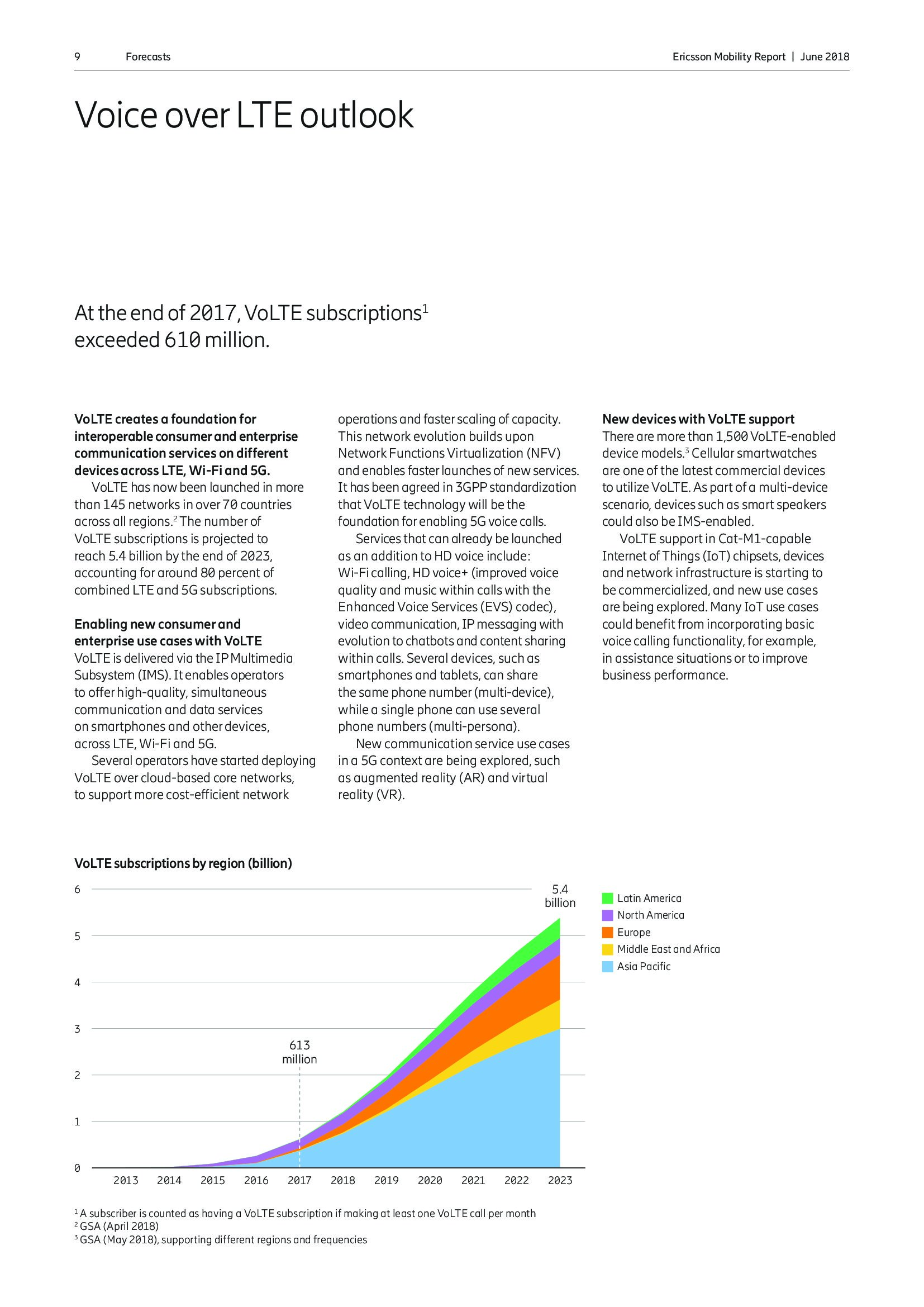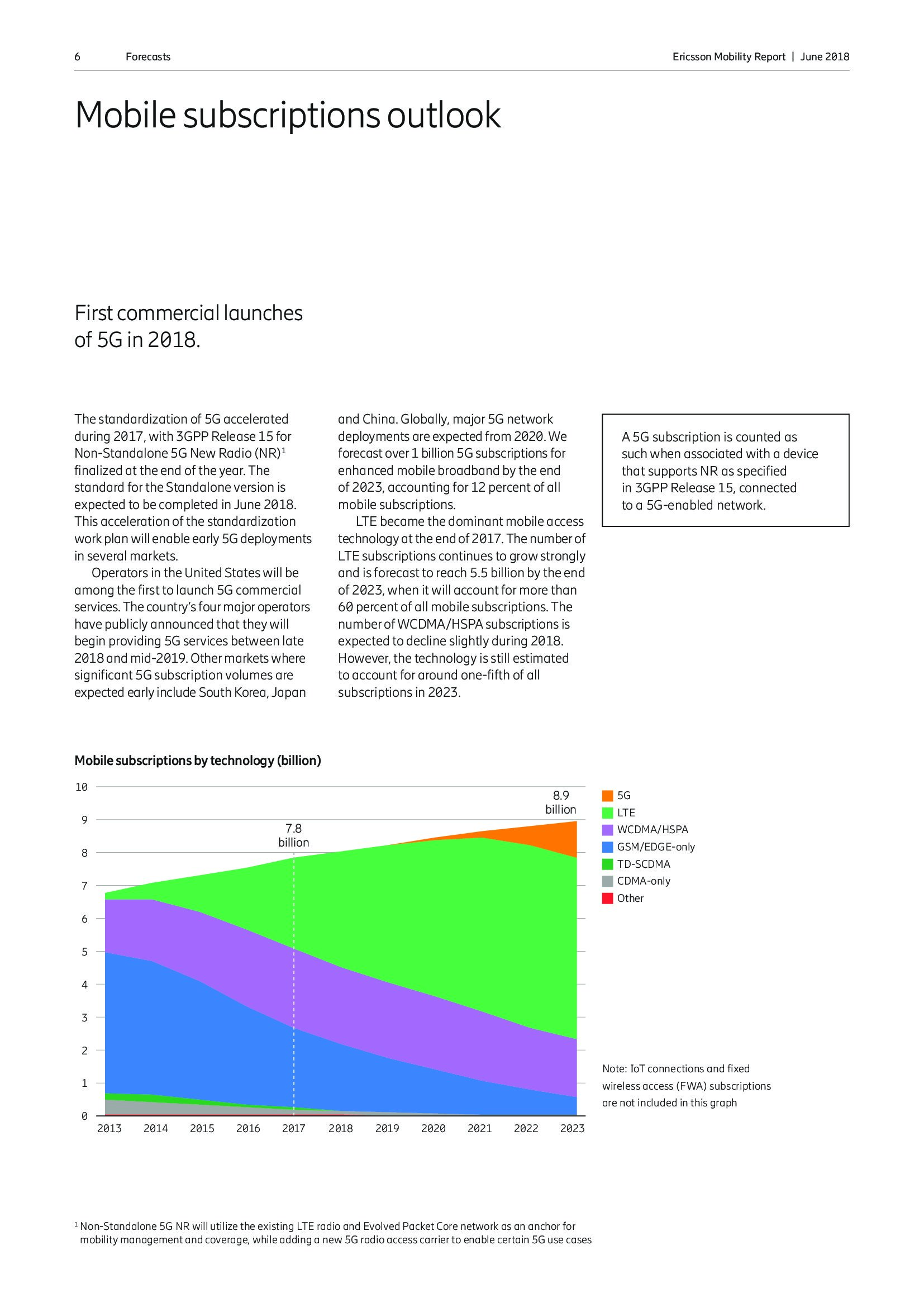 LTE在2017年底成为主流的移动接入技术,其订购数量继续保持强劲增长,预计到2023年底将达到55亿,占所有手机签约数量的60%以上。