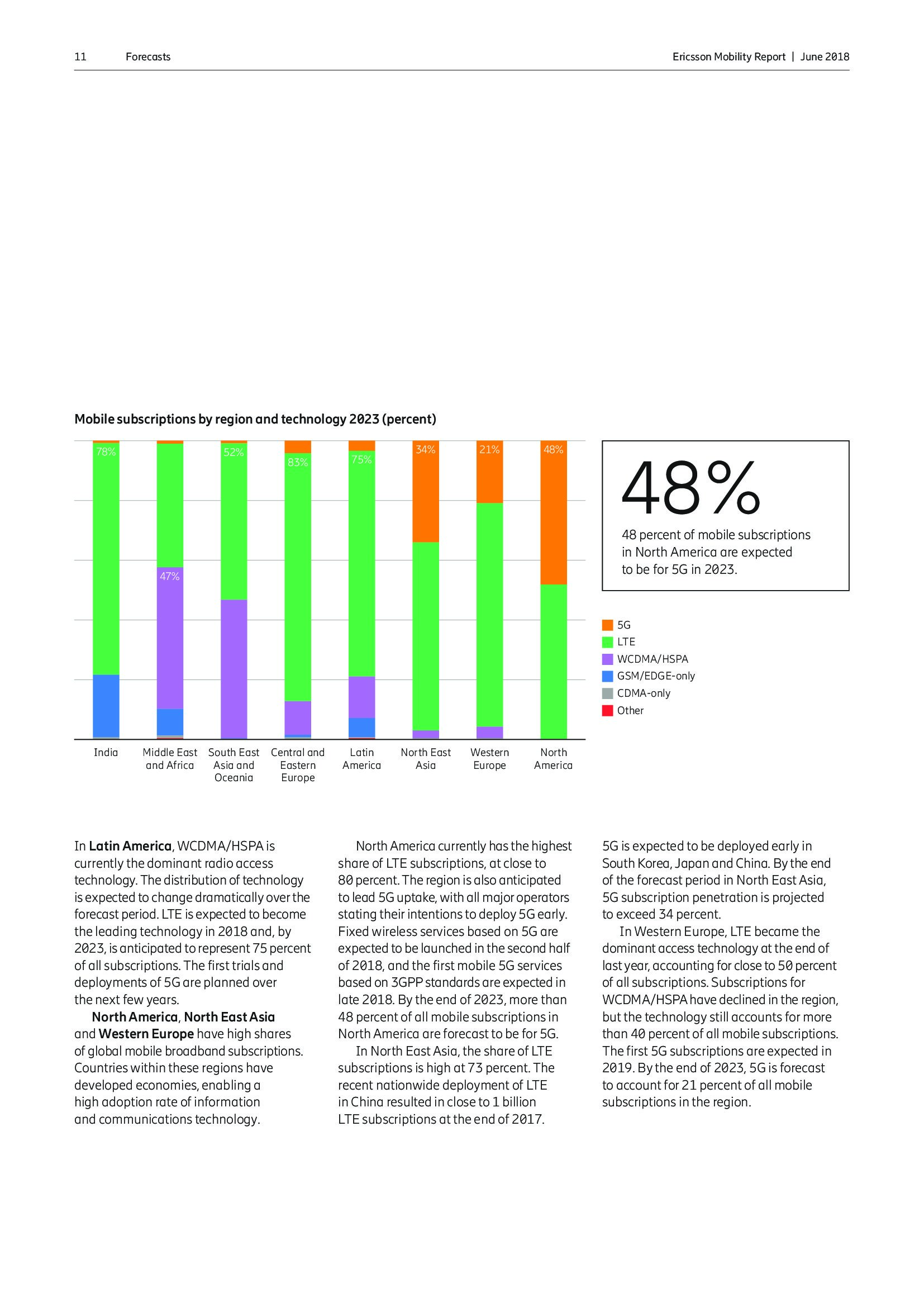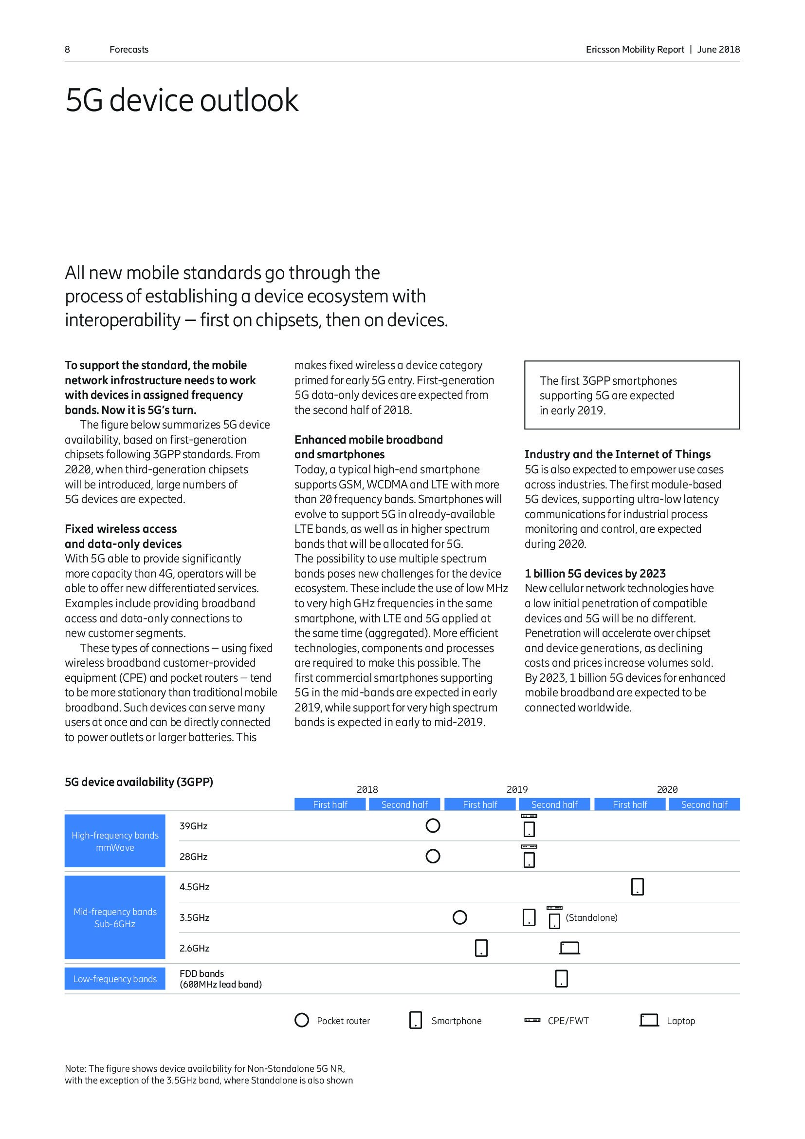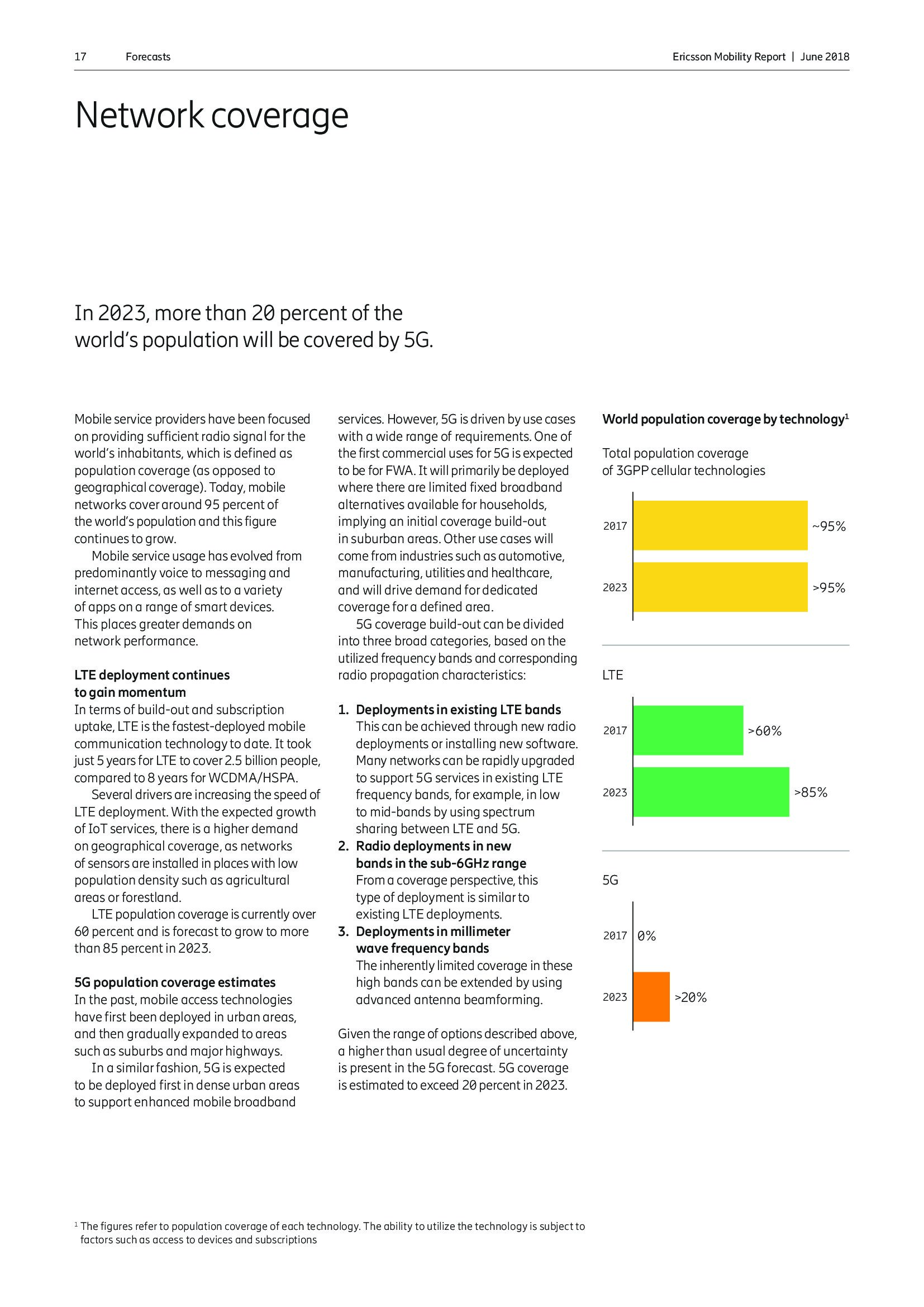 美国运营商将率先推出5G商用服务,四大运营商已经宣布,2018年底至2019年中期开始提供5G服务。其他先行者还包括韩国、日本和中国。预计到2023年底,增强型移动宽带将有10亿连接运行在5G上,占手机用户的12%。