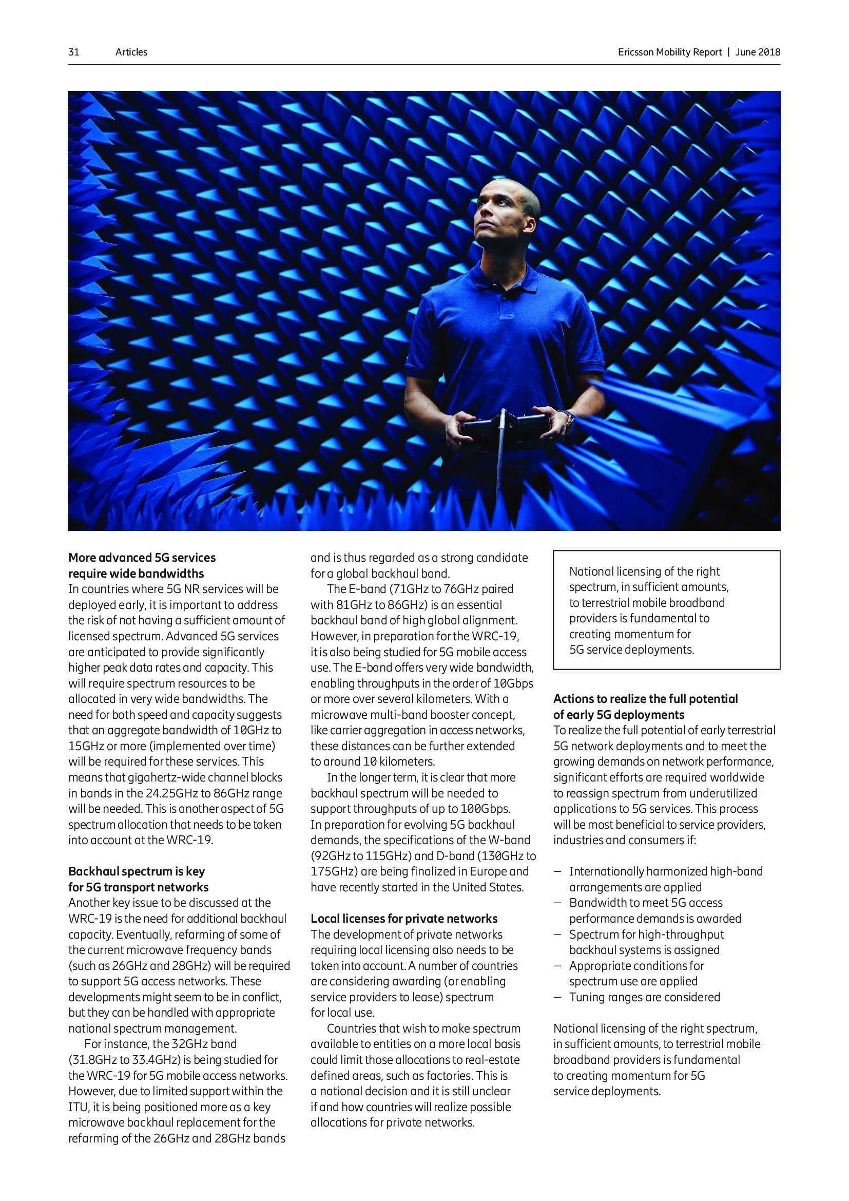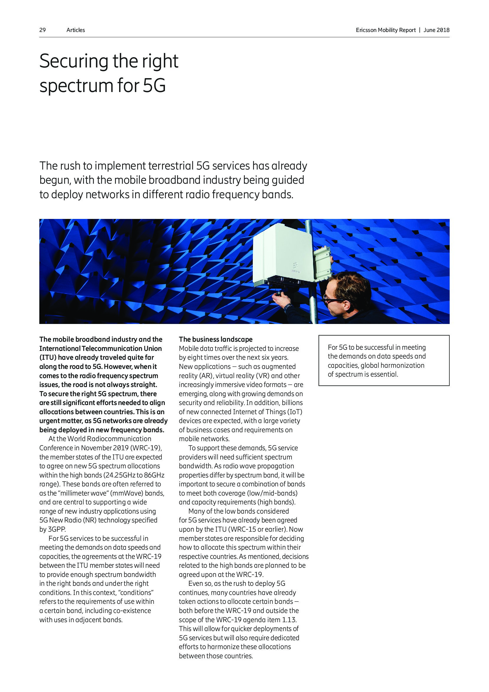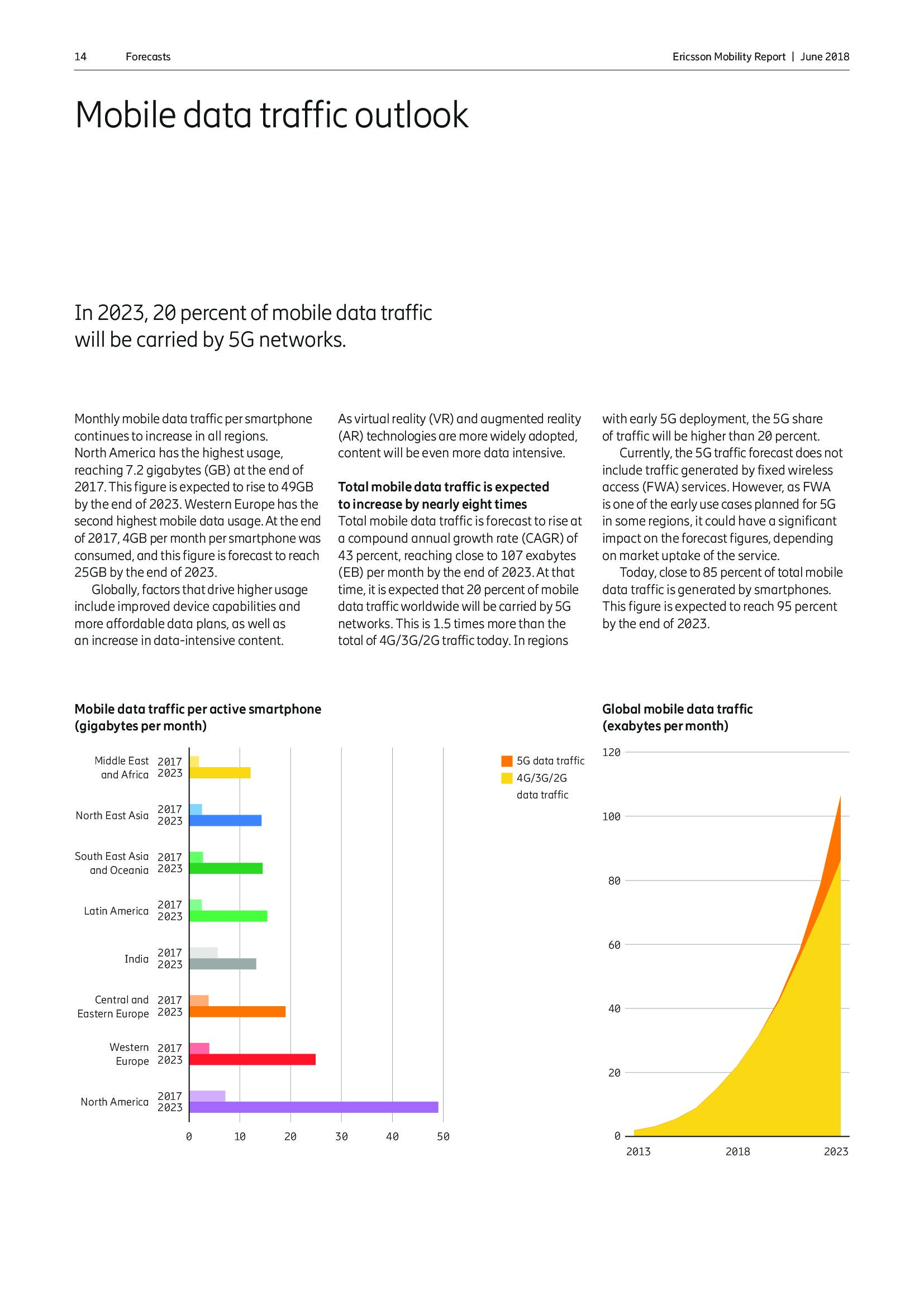 美国运营商将率先推出5G商用服务,四大运营商已经宣布,2018年底至2019年中期开始提供5G服务。其他先行者还包括韩国、日本和中国。预计到2023年底,增强型移动宽带将有10亿连接运行在5G上,占手机用户的12%。