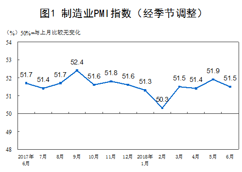 2018年6月份,中国制造业采购经理指数(PMI)为51.5%,比上月回落0.4个百分点,仍高于上半年均值0.2个百分点,制造业总体继续保持扩张态势。