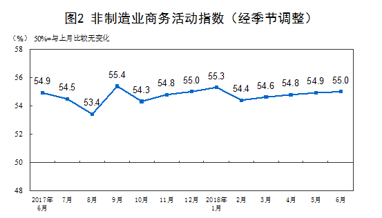 2018年6月份,中国非制造业商务活动指数为55.0%,比上月上升0.1个百分点,高于上半年均值0.2个百分点,非制造业总体保持平稳向好的发展势头。