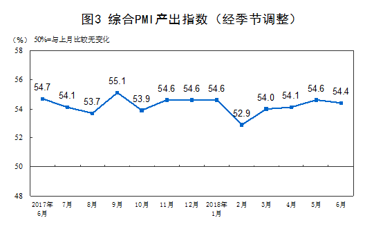 2018年6月份,综合PMI产出指数为54.4%,低于上月0.2个百分点,仍高于上半年均值0.3个百分点,继续位于临界点以上,表明我国企业当期生产经营活动总体延续平稳较快的扩张态势。