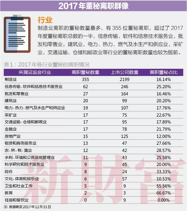 统计数据显示,2017年A股市场共有615位董秘离职,其中制造业离职的董秘数量最多,共有355位董秘离职,超过总数的一半,另外信息传输、软件和信息技术服务业,批发和零售业,建筑业,电力、热力、燃气及水生产和供应业,采矿业,交通运输、仓储和邮政业离职董秘数量也居前列。