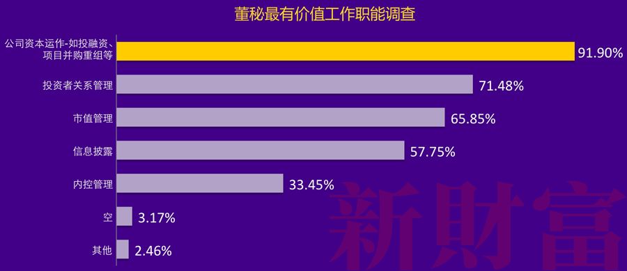 2018年第十四届新财富董秘评选中进行的调查显示,高达92%的董秘认为资本运作已经成为董秘的最有价值的工作职能,投资者关系管理、市值管理、信息披露分别以71.5%、65.85%和57.75%的比例紧随其后。