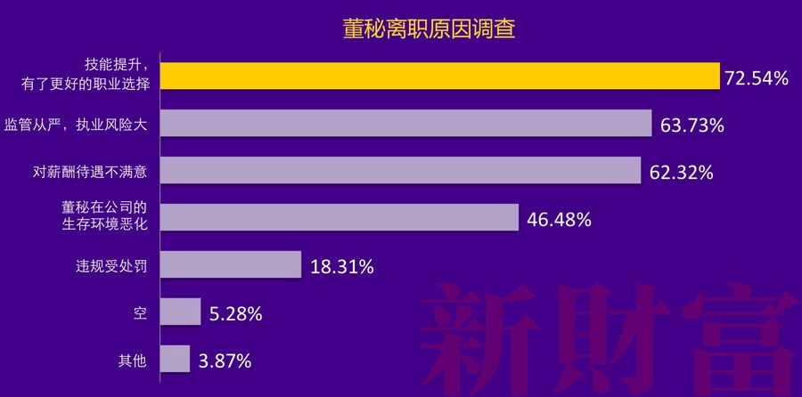 调查显示,董秘们认为离职的最大原因是职业技能获得提升,有了更好的职业选择,占比达到73%,此外,对薪酬待遇不满以及监管从严、执业风险加大也是董秘离职的重要原因,占比分别达到62%和64%,所处公司环境恶化和违规受处罚被动离职,也是导致董秘离职的重要因素。