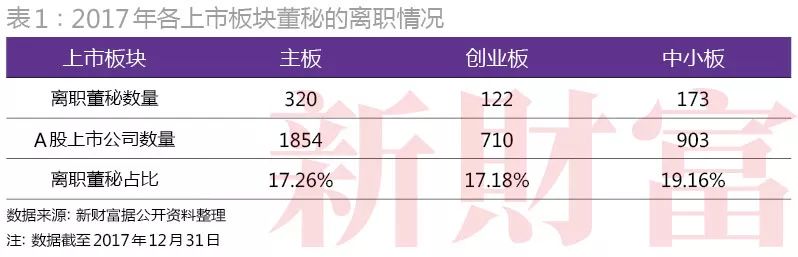 从过去五年离职董秘看,自2013年至2016年离职董秘的数量持续增加,2016年达到顶峰。2017年尽管离职董秘有所减少,但依然处于高位。统计数据显示,2017年615位董秘离职中,主板有320位,占比接近一半,创业板和中小板分别有122位和173位董秘选择离职。