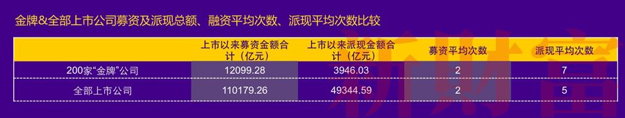 新财富统计数据显示,本届200家“金牌”公司上市以来募集资金合计达到1.2万亿元,2017年度募资金额合计接近2000亿元,其中招商银行、兴业银行、顺丰控股等数家公司募集资金都达到百亿规模,另外,这些公司的派现融资比均值、平均派现次数也高于其他上市公司,显示出金牌公司具有较强融资能力。