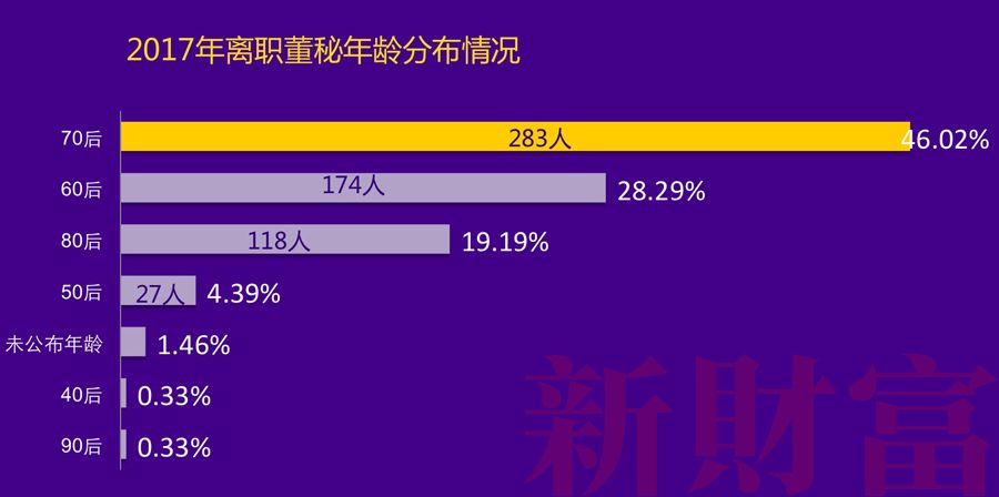 这一比例反映出董秘年轻化进程的加快,2005年董秘职群35岁以下仅占5%,而55岁以上的董秘占比达到17%。而这一现象也反映在离职数据中,在2017年离职的董秘中,有283位70后,占所有离职董秘的数量近一半;60后次之,有174位董秘离职;离职的80后董秘也达到了118位;同时也有两位90后的董秘离职。