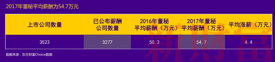 每年的董秘生存报告,薪酬是大家关注的重点。东方财富Choice数据显示,2017年度,3277家上市公司共计为董秘发放17.93亿元的薪酬,同比上涨11%,平均薪酬为54.7万元,相较于2016年50.3万元的平均水平,董秘平均涨薪4.4万元(表6)。