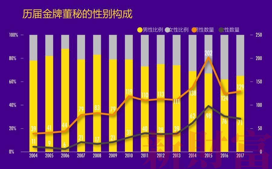 而从男女比例来看,尽管薪酬最高的董秘为女性,但男性董秘的薪酬仍远超女性董秘。在薪酬排名前20的董秘中,仅有四位女性,男性董秘则有16位。在本届新财富金牌董秘中,男性有130人,占比65%,女性有70人,占比35%,女性董秘的上榜率逐年稳定。