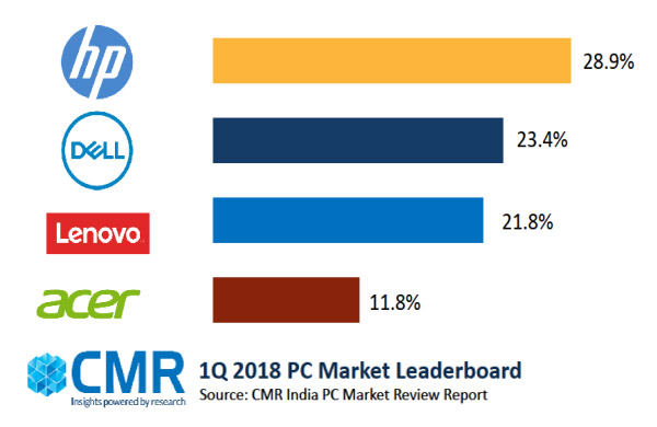 市场领导者惠普在2018年第一季度印度PC市场占有28.9%的份额,主要得益于较高的零售普及水平,以及关注客户和迎合游戏PC的举措。