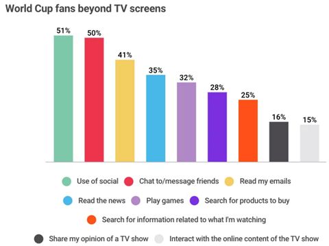 根据GlobalWebIndex对超过34100的世界杯观众进行的调查显示,超过一半(51%)的球迷在电视上观看比赛的同时会使用社交媒体,而一半的球迷会一边看比赛一边和朋友聊天或发信息。这些调查结果反映在今年世界杯营销活动的时间点上。Zenith的预测和全球情报总监Jonathan Barnard表示,世界杯期间媒体支出的真正增长发生在比赛开始后而不是开赛前。各大品牌似乎都专注于对现场和场外事件做出即时的反应,而不是依赖于开赛前写好的脚本。