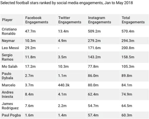 随着足球运动员成为娱乐、风尚的偶像,球迷对他们的忠诚度也加深了。根据研究统计,今年1月到5月期间,葡萄牙的C罗在社交媒体上获得了5.7亿点赞、评论和转发量,比排名第二的内马尔高出逾2.7亿。Jonathan Barnard表示,“各大品牌现在想要通过更多的个人故事来打造自己的战略,所以要追逐力捧球员而不是团队”。
