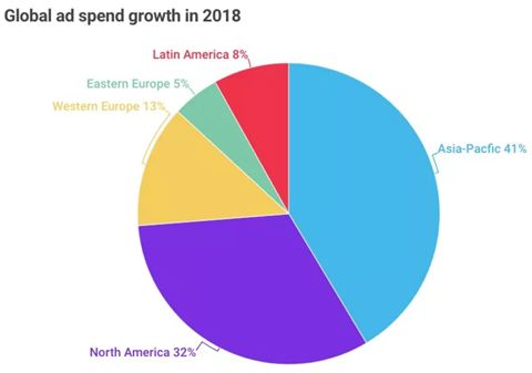 (图五 2018年全球广告支出分布 来源:Dentsu Aegis)