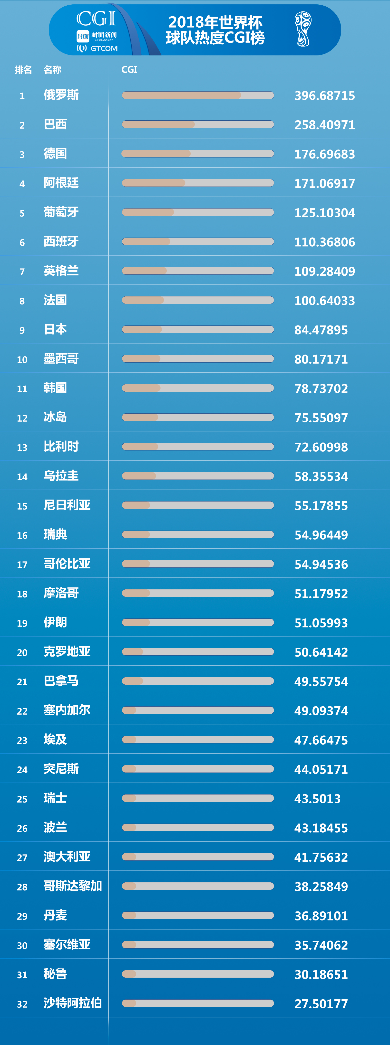 为了彻底解决这个问题,让更多球迷少去一趟天台思考人生。7月2日,封面新闻、中译语通和封面智库联合发布了《2018世界杯球队热度CGI榜》,根据球队在全球各大媒体以及社交网站上的搜索量、讨论量、情感倾向等数据,对本次世界杯32支参赛球队的关注度进行了评估排名,为球迷提供一个不错的冠军预测依据。
