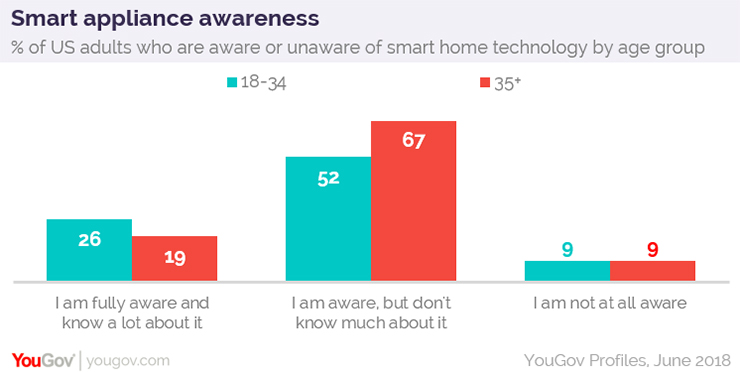 调查显示,尽管大多数美国消费者(62%)知道这些智能设备能够连接到互联网并可以通过手机或平板电脑控制。但是,大多数人承认他们对这些智能设备知道的并不多。18-34岁的成年人中有超过一半(52%)知道这些设备,但是知之甚少,而35岁以上的成年人有67%这么表示。