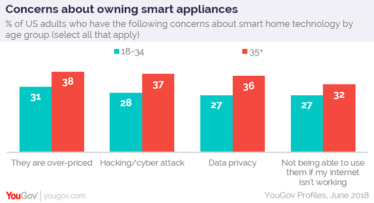关于新的小工具的担忧也是多种多样的,从设置困难到记住另一个密码。但是,最大的担忧是成本,36%的美国人担心智能家电价格过高。34%的消费者担心被黑客攻击,33%的受访者对数据隐私感到不安,30%的消费者担心如果他们的互联网无法使用,就无法使用这些设备。
