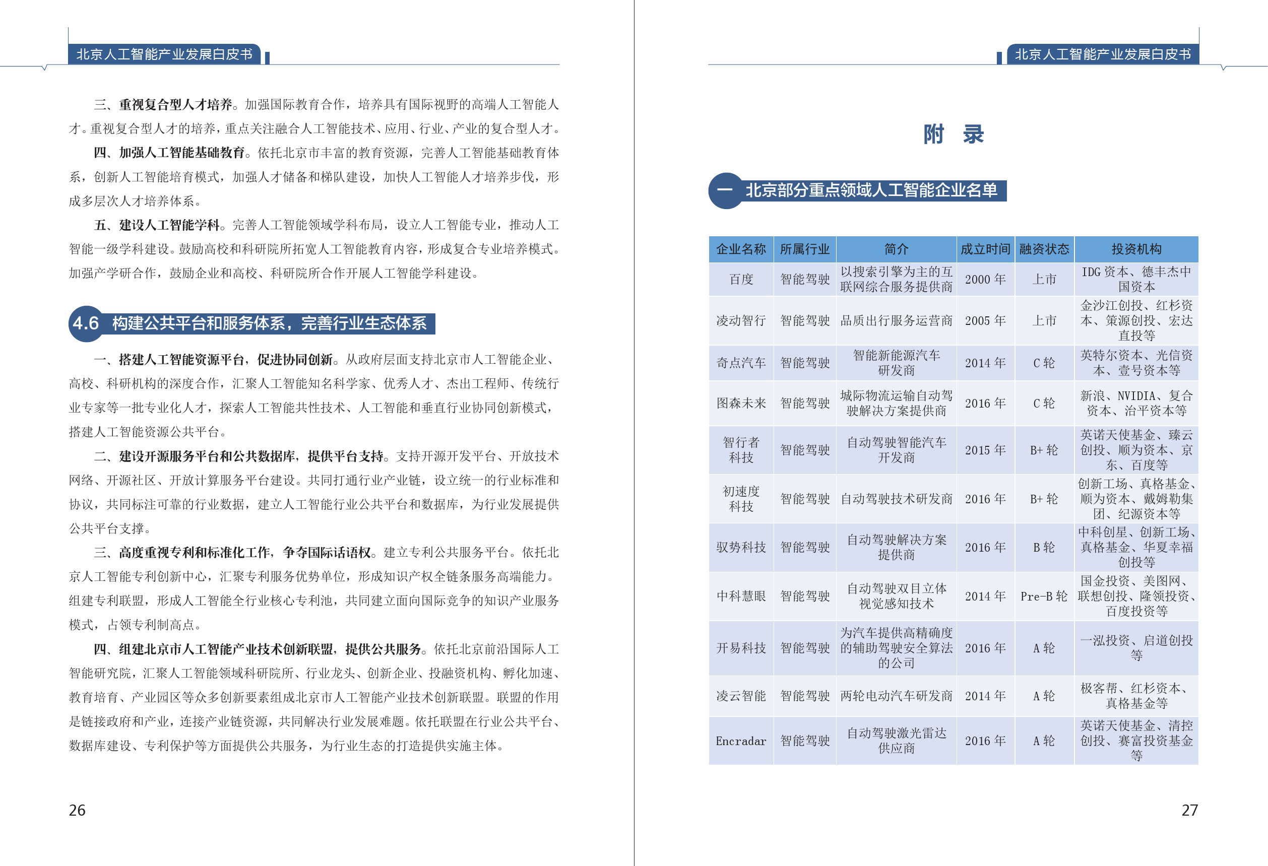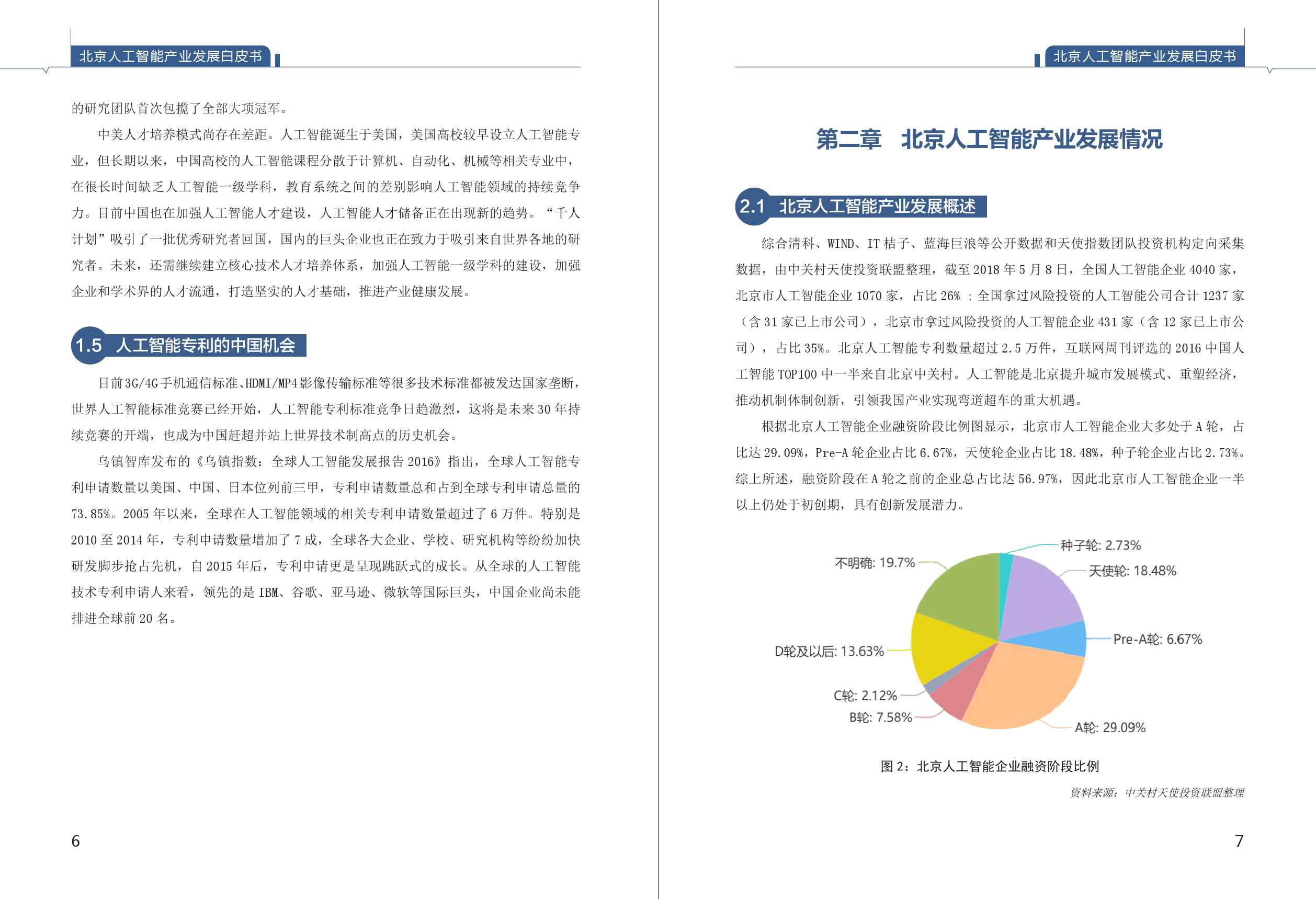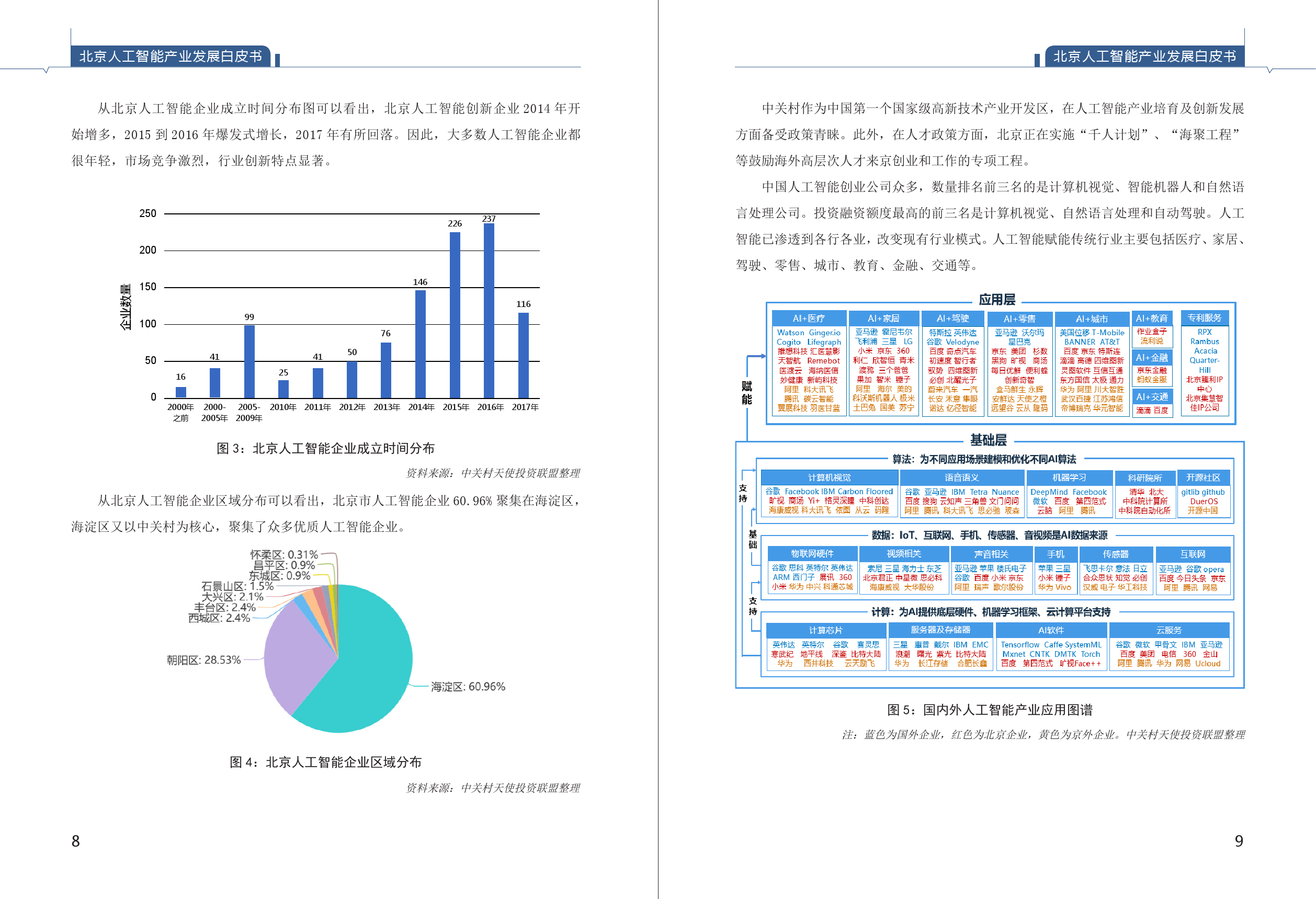 《白皮书》首次摸清了北京人工智能产业底数。综合清科、WIND、IT桔子、蓝海巨浪等公开数据及投资机构定向采集数据,由课题组整理,截至2018年5月8日,全国人工智能企业4040家,北京市人工智能企业1070家,占比26% ;全国拿过风险投资的人工智能公司合计1237家,北京市拿过风险投资的人工智能企业431家,占比35%。从融资阶段看,北京人工智能企业一半以上仍处于初创期,在A轮之前的企业占比达56.97%,具有创新发展潜力。从企业成立时间看,北京人工智能企业2015-2016年呈现出爆发性增长,人工智能快速增长特征明显。从区域看,60.96%的人工智能企业注册在海淀区。中关村成为我国人工智能创新高地。