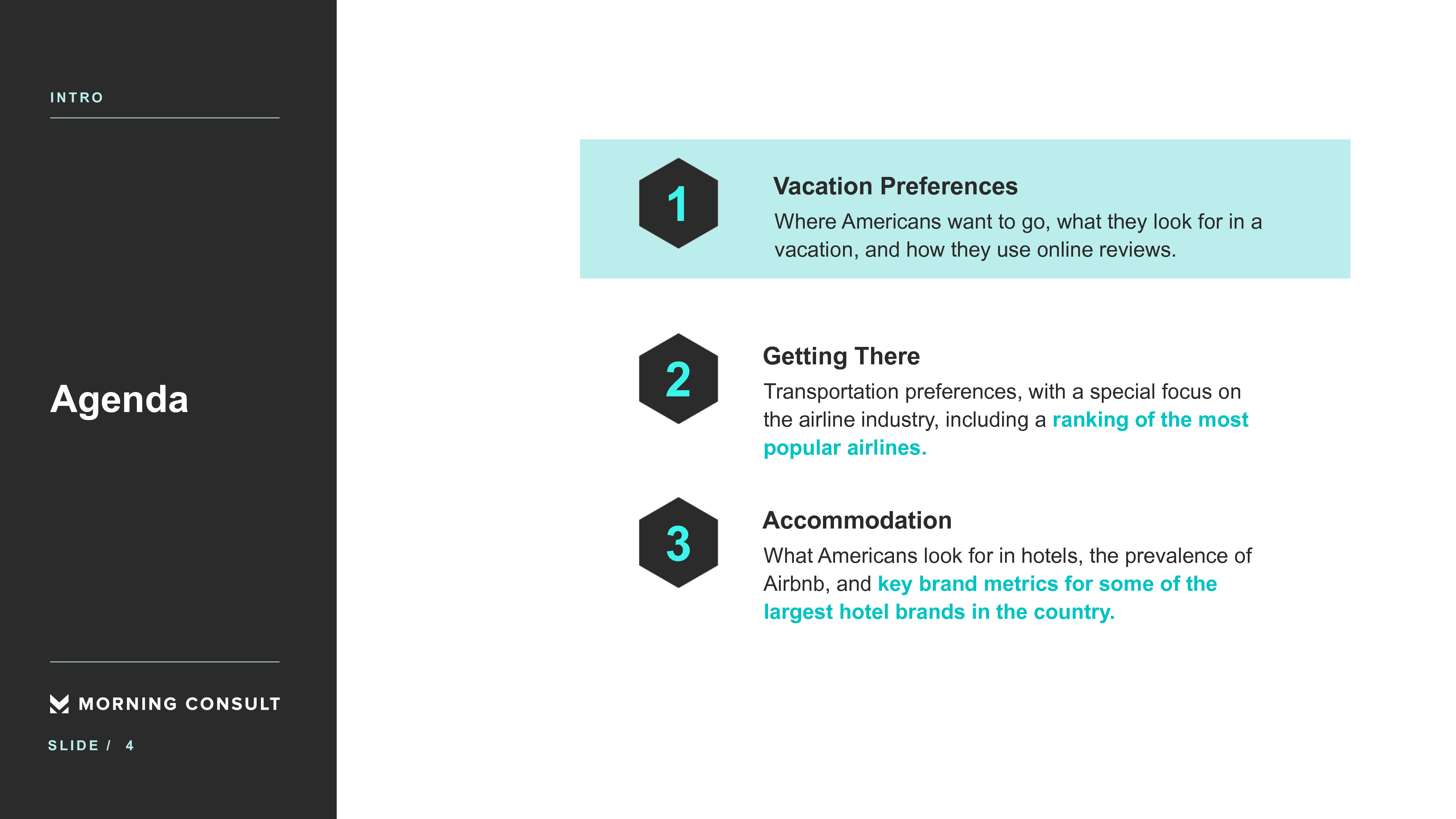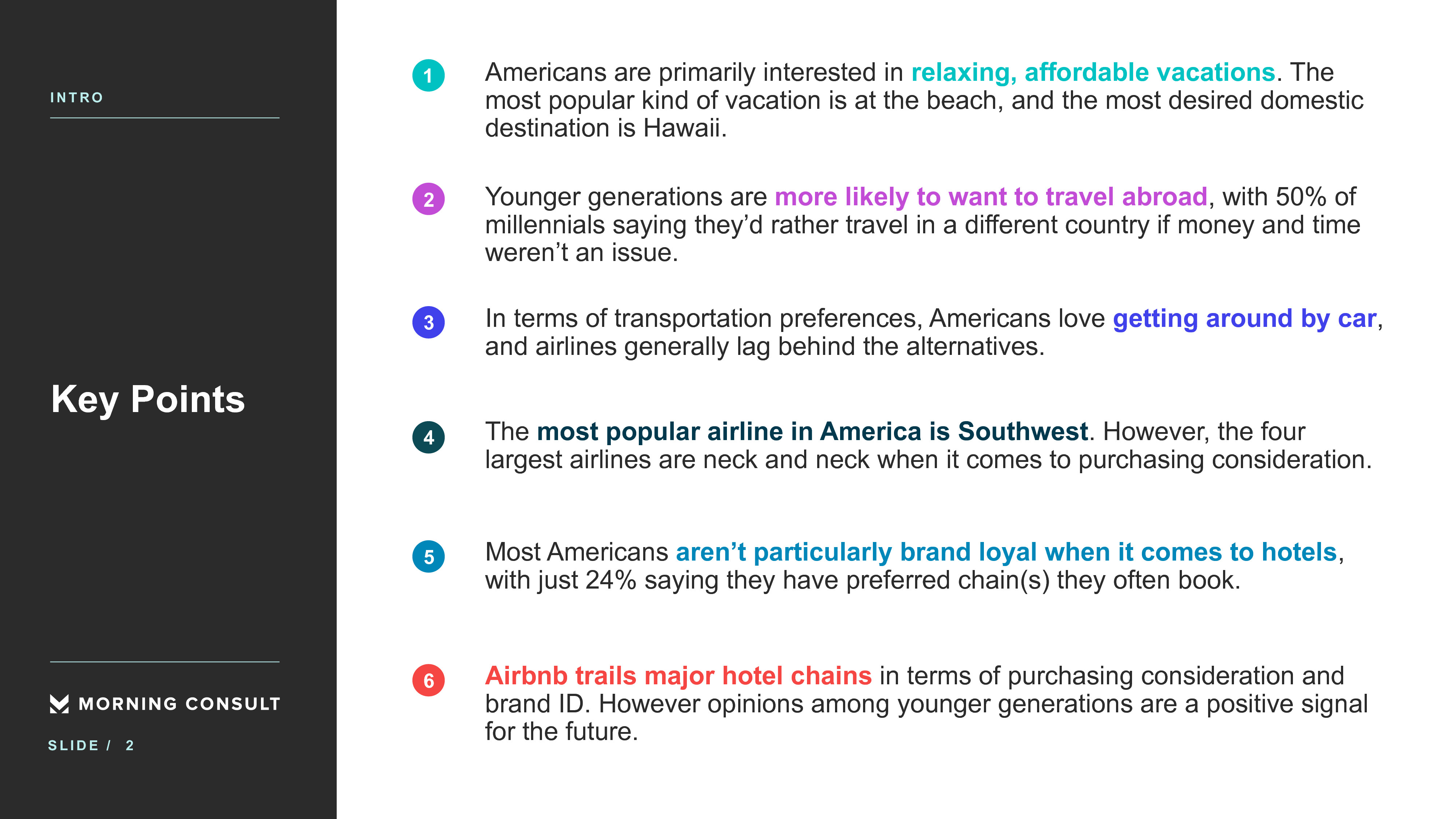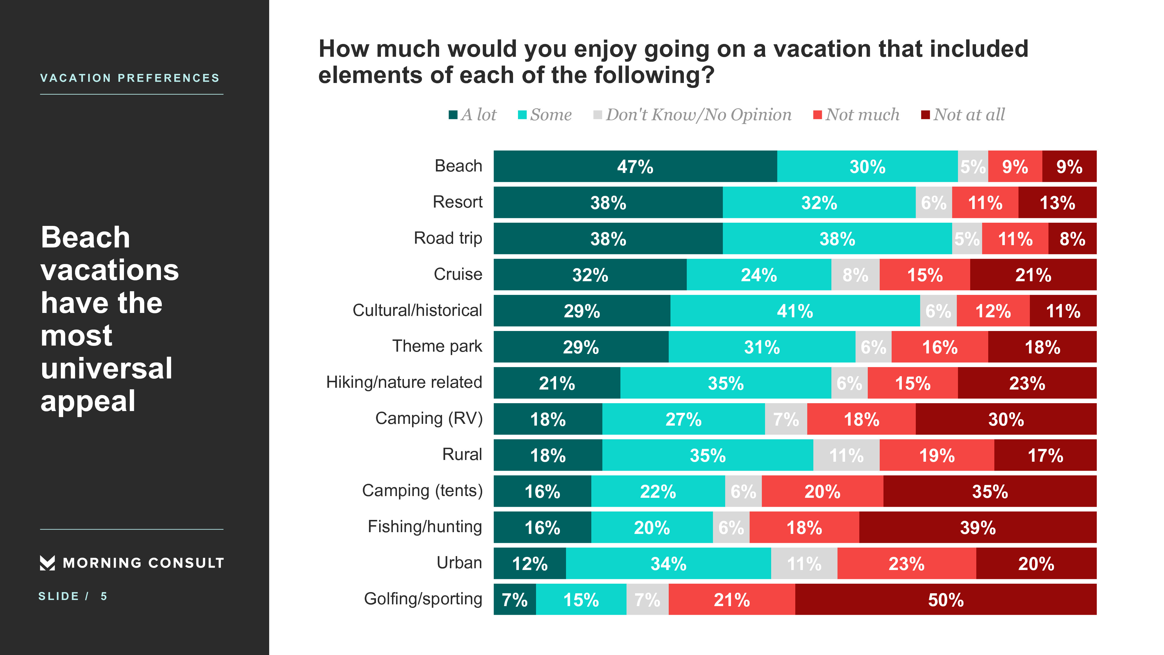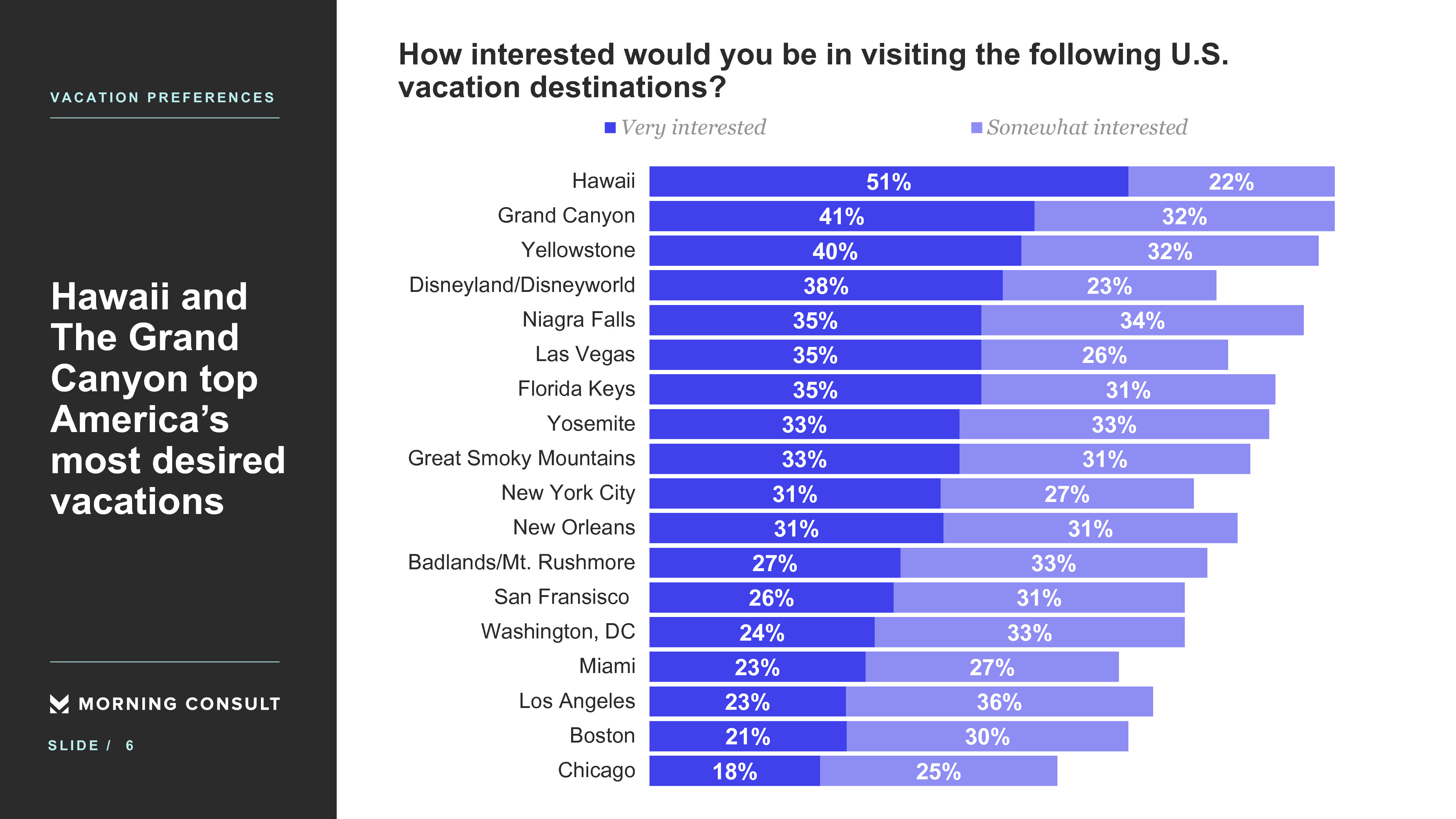 最受欢迎的目的地是在海滩上,其次是度假胜地和公路旅行。最期望的国内目的地是夏威夷,其次是大峡谷和黄石公园。