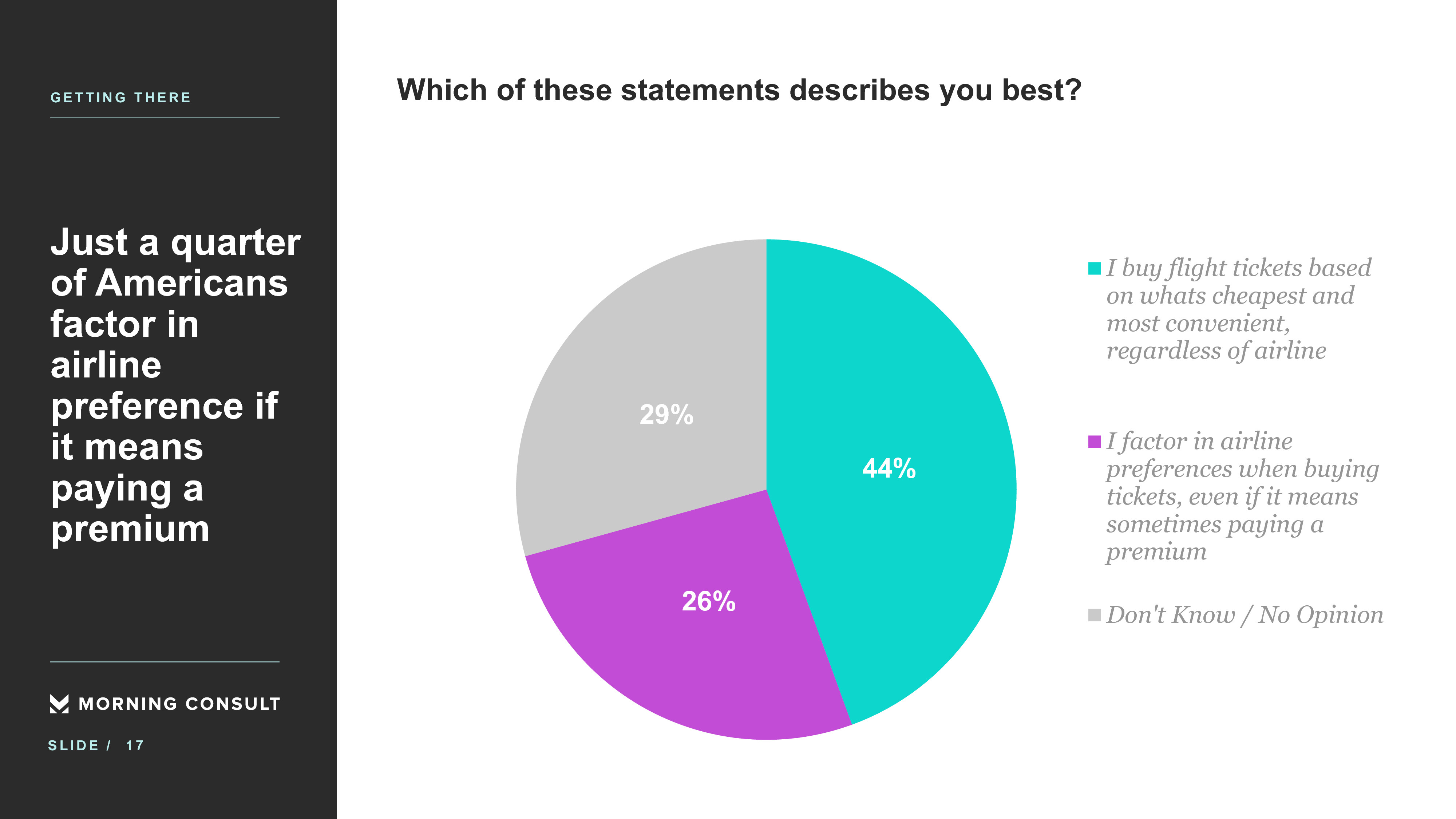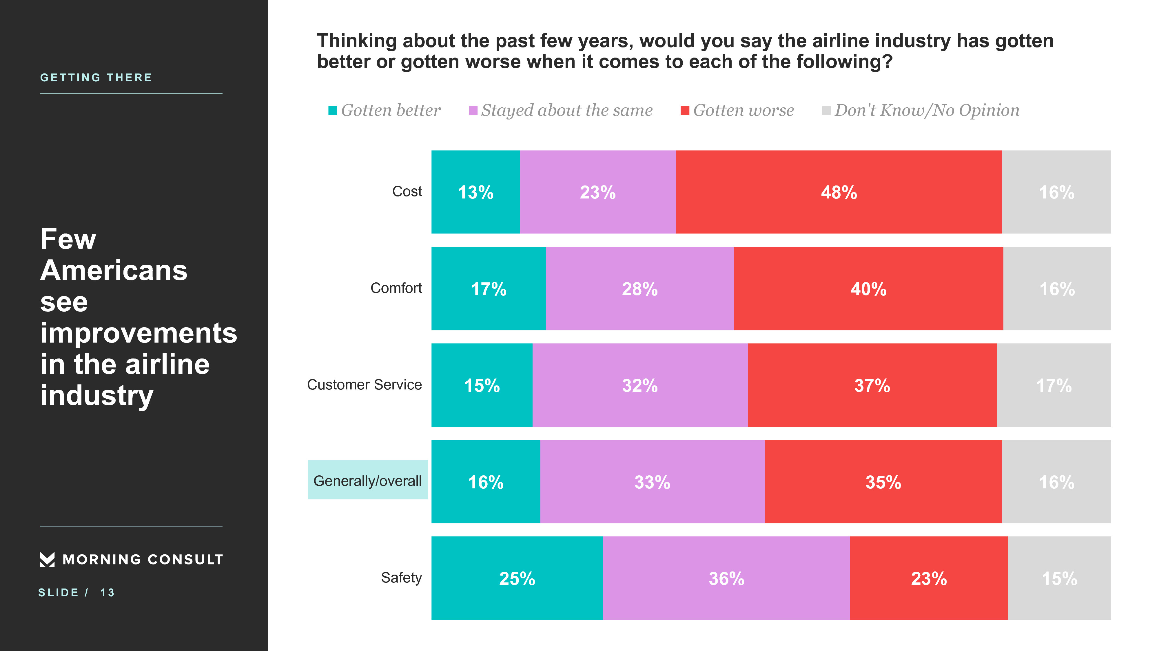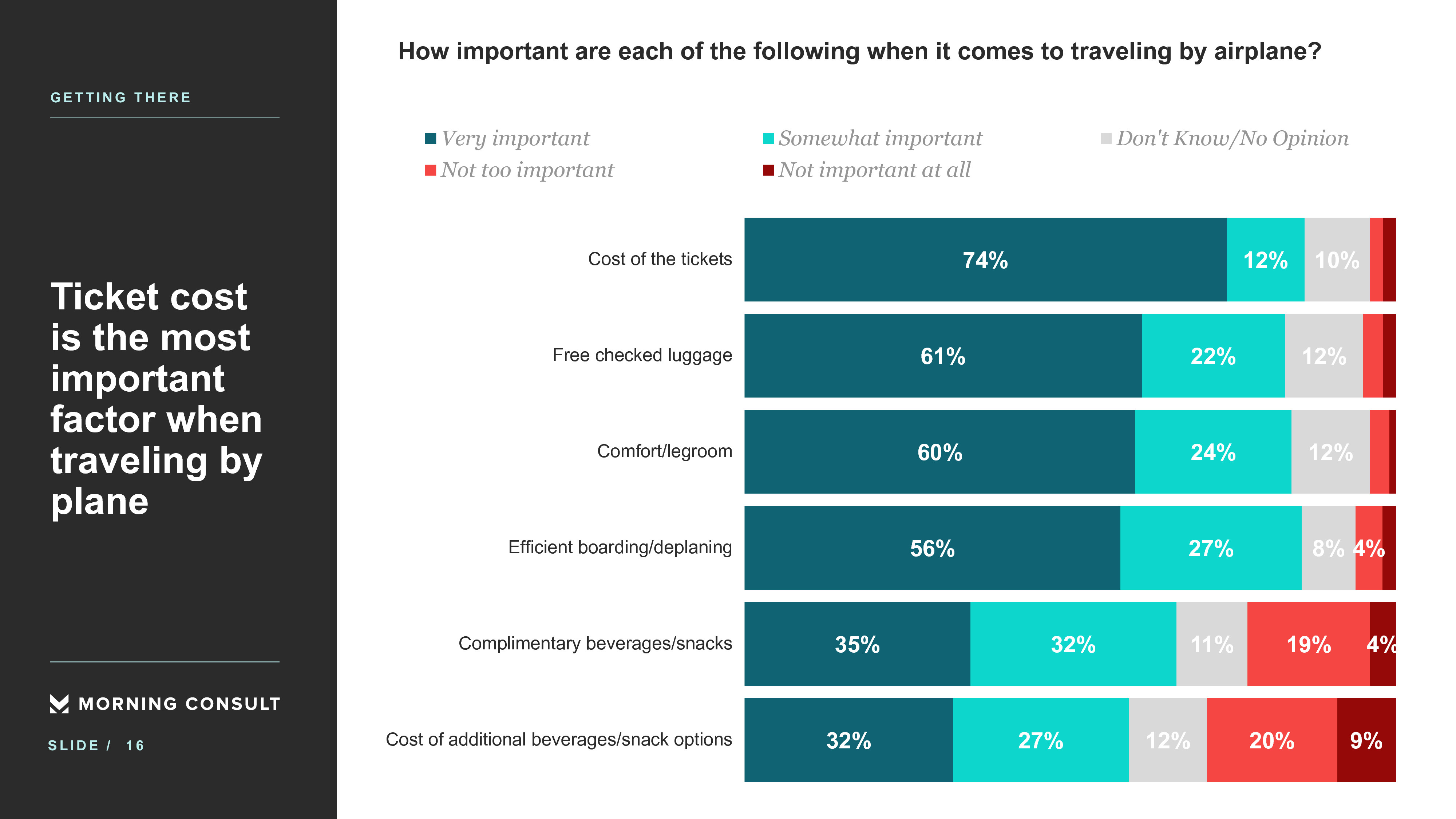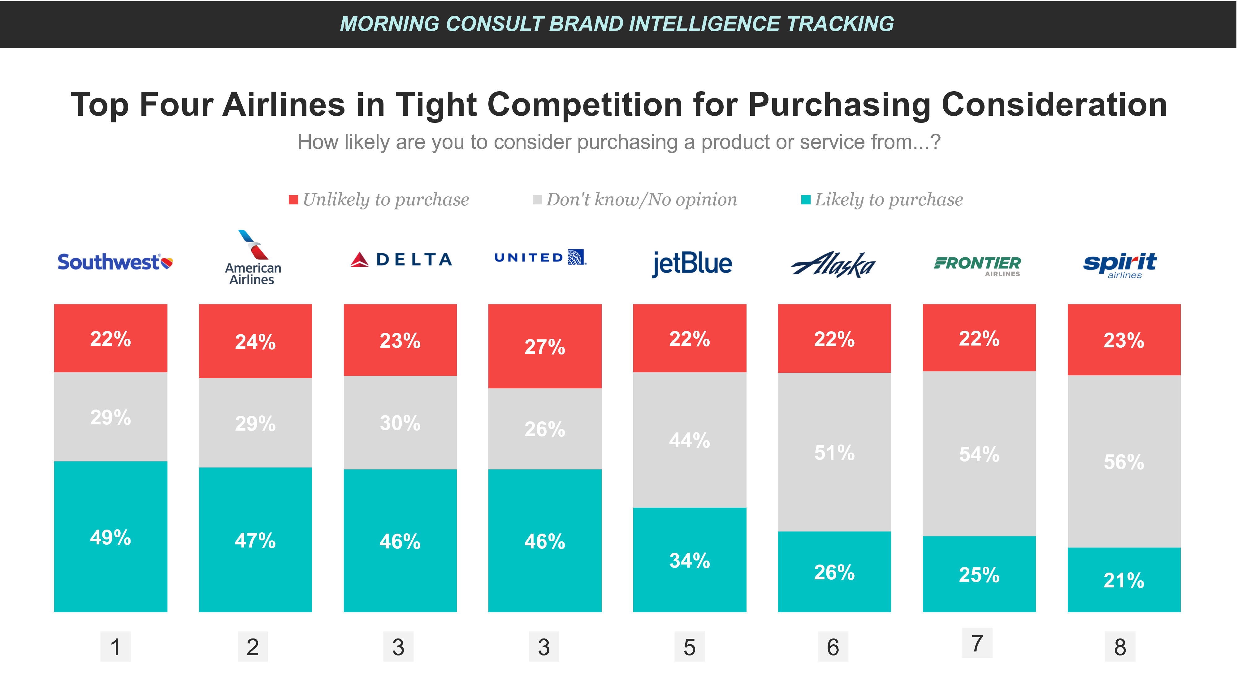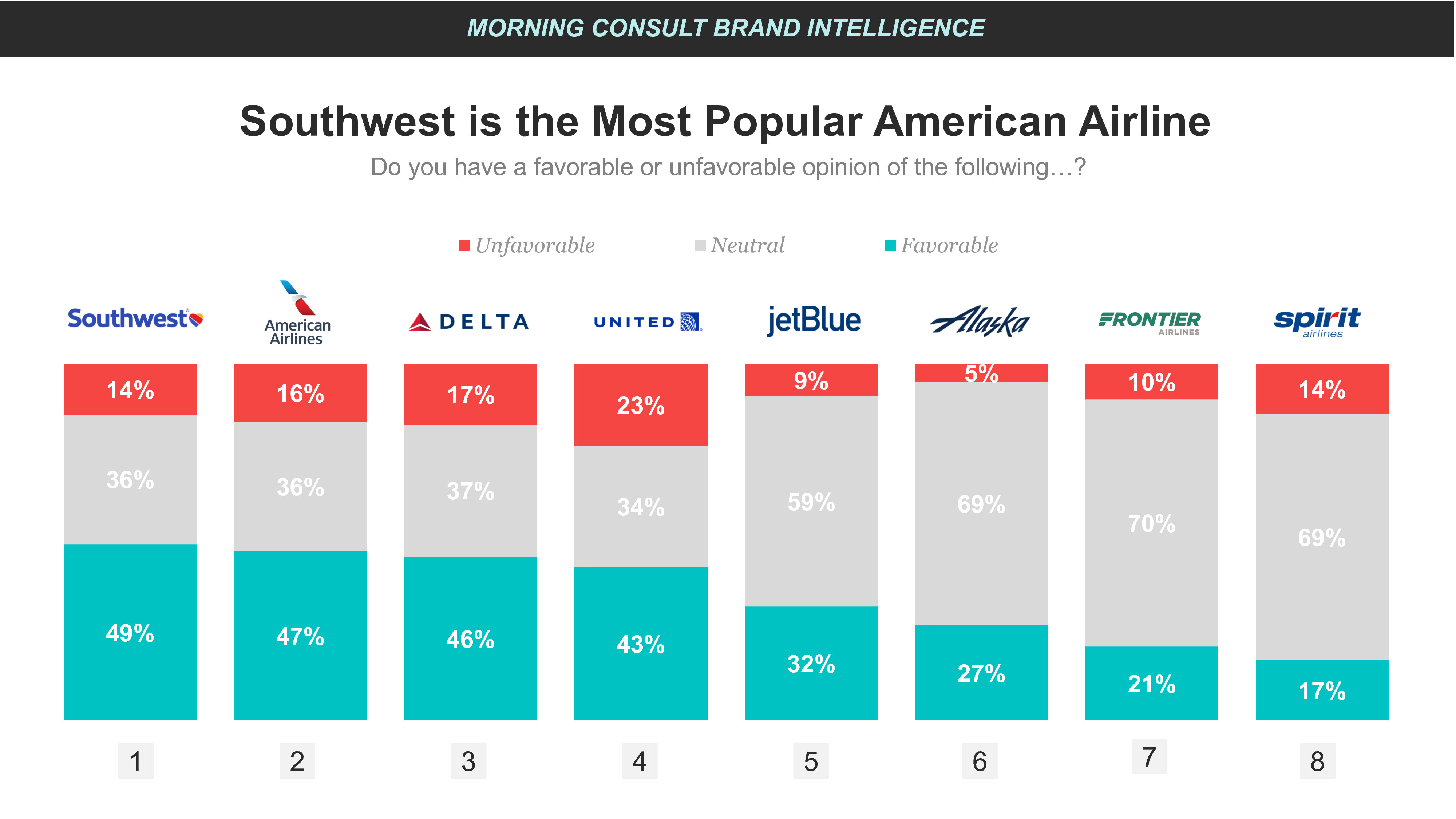 就交通偏好而言,美国人喜欢乘汽车出行,而航空公司通常落后于其他选择。美国最受欢迎的航空公司是西南航空。但是,从订购方面考虑,四家最大的航空公司不分伯仲。过去几年,飞机的成本、舒适度和客户服务都变的更糟了。