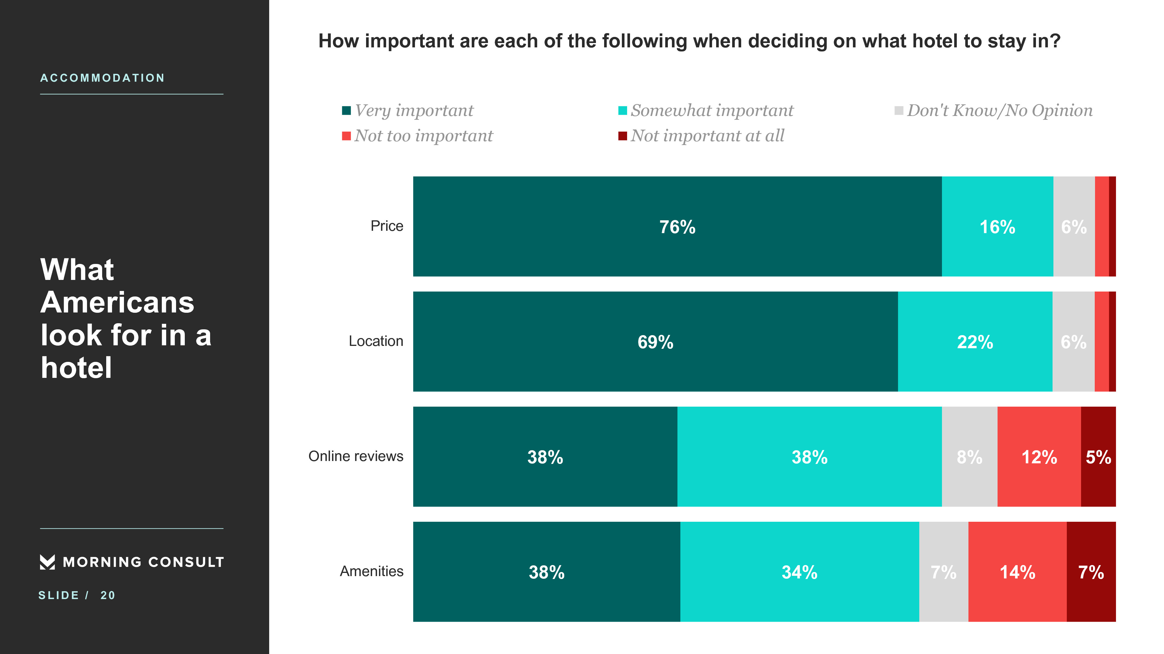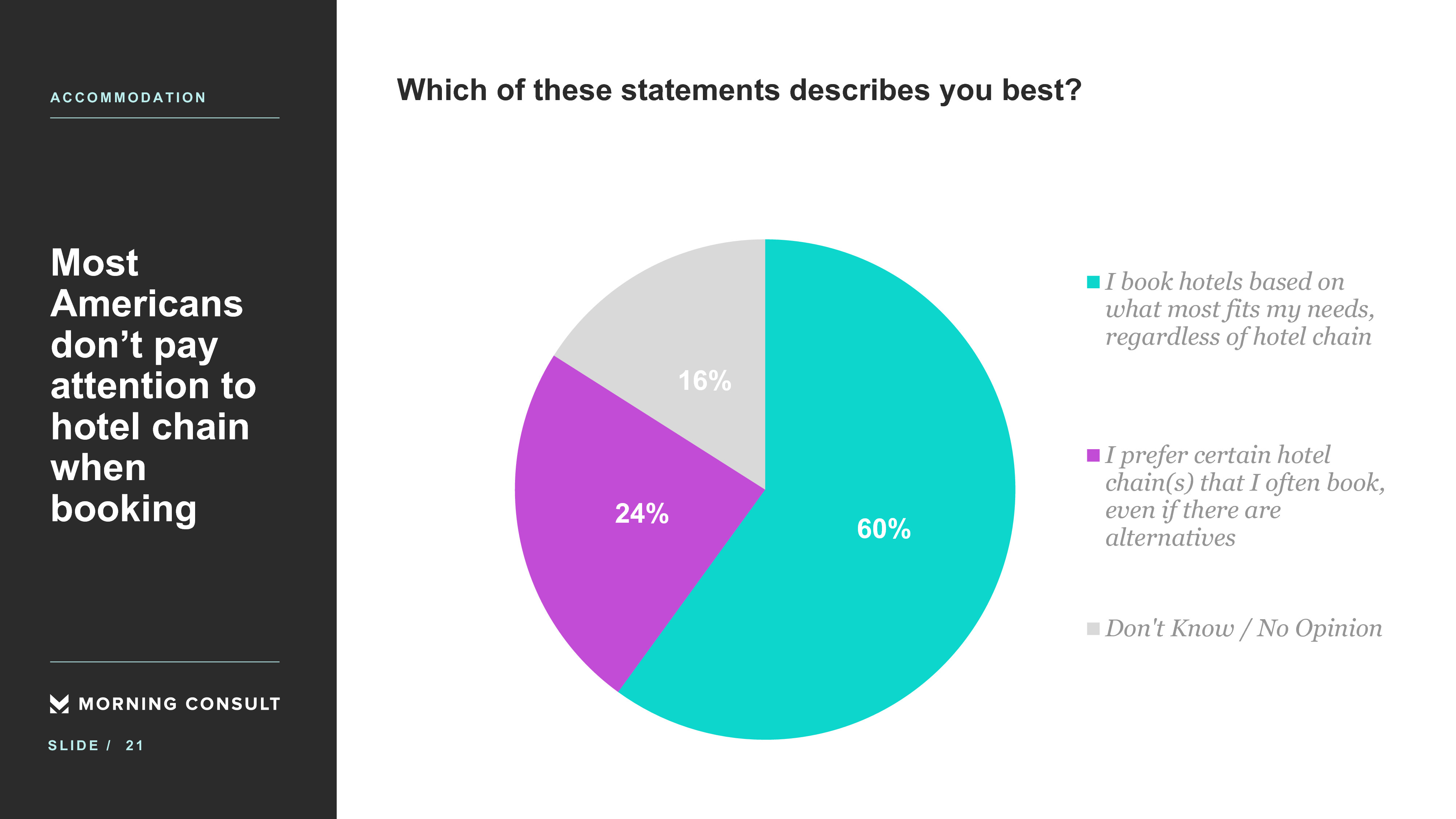 在酒店方面来看,大多数美国人并不特别忠实于品牌,只有24%的美国人表示他们更喜欢经常预订的连锁店。