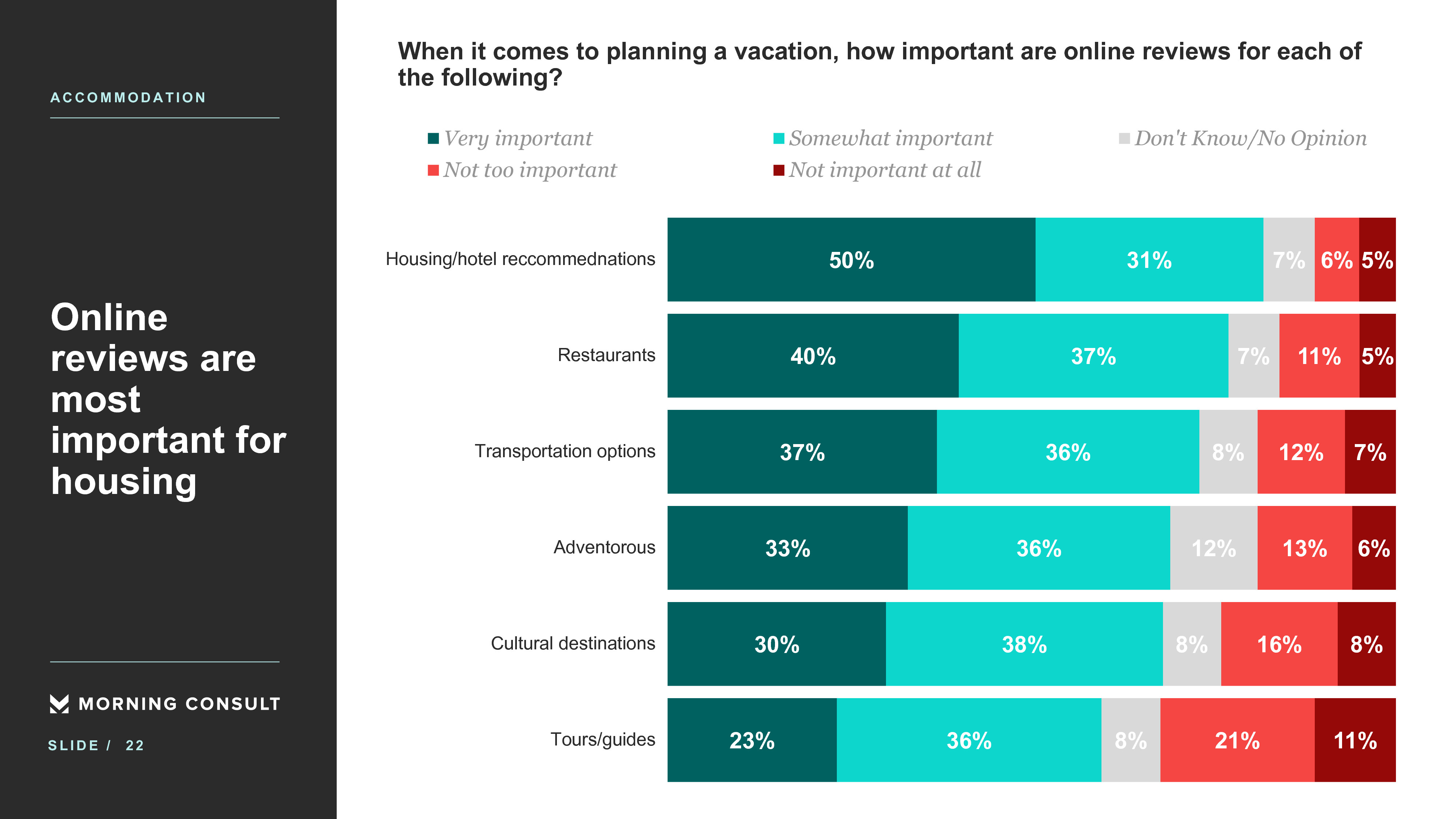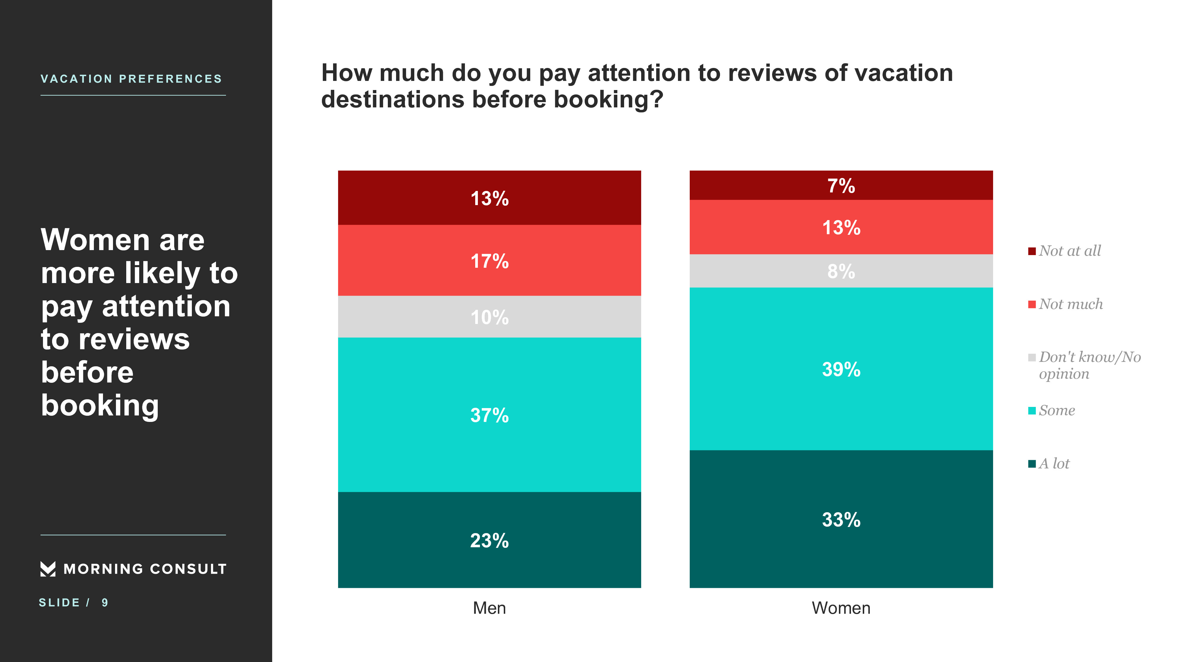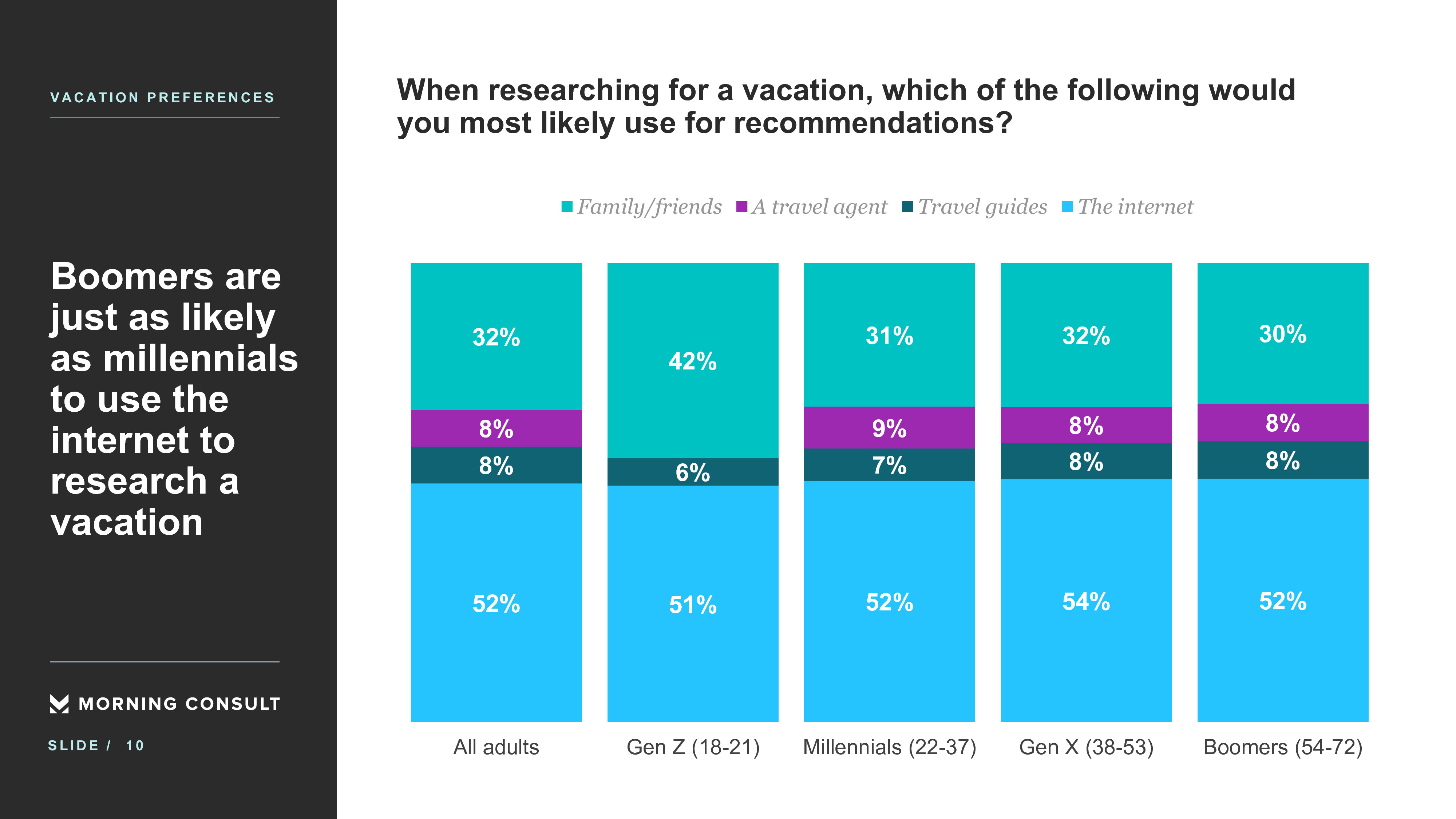 女性更可能在订购之前阅读度假目的地的评价(72%),尽管男性不那么关注,但是也有超过半数人(60%)会阅读评价。而互联网已经成为所有人获得推荐的渠道,这一点对所有年龄段的人都如此(52%)。