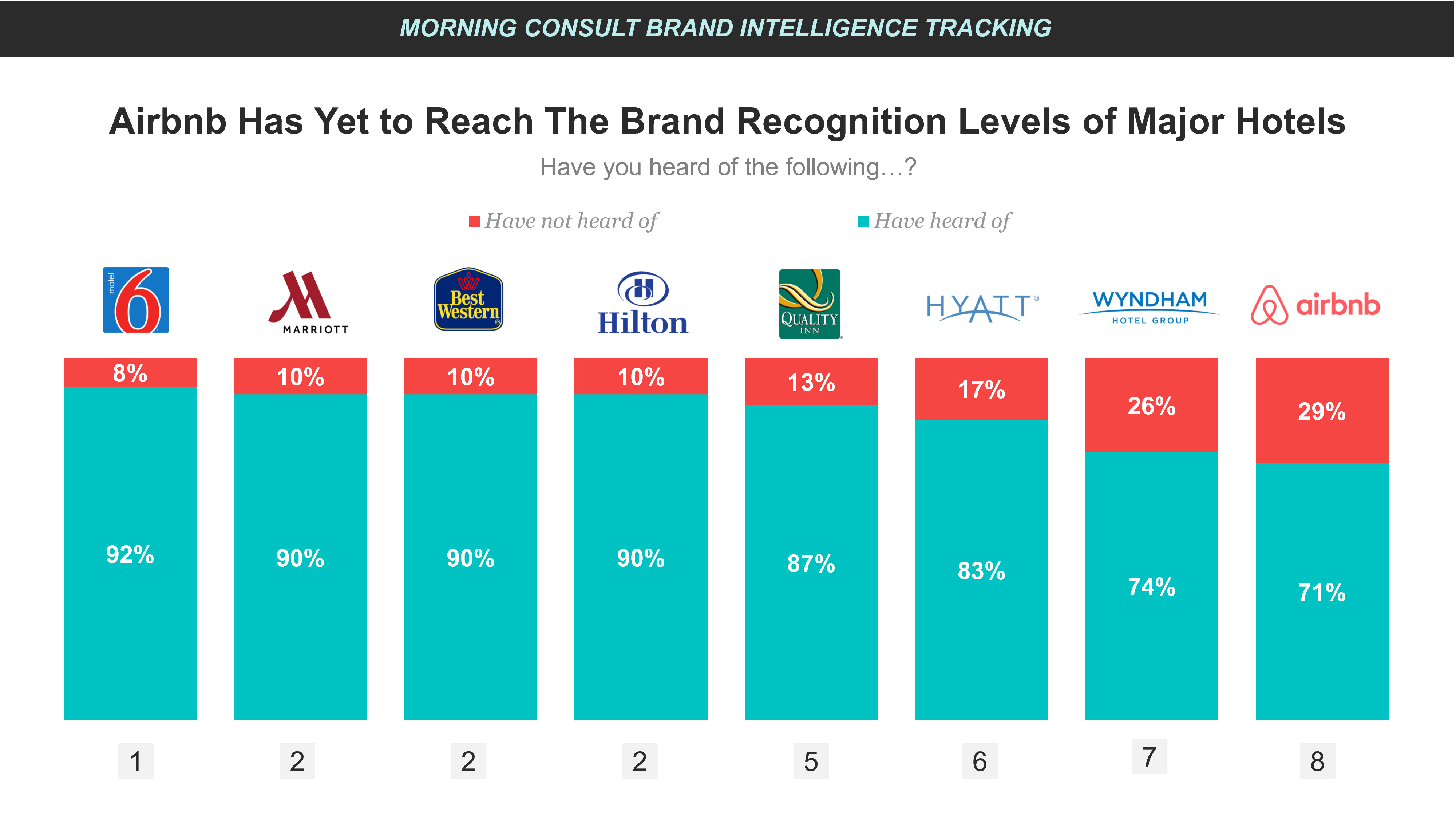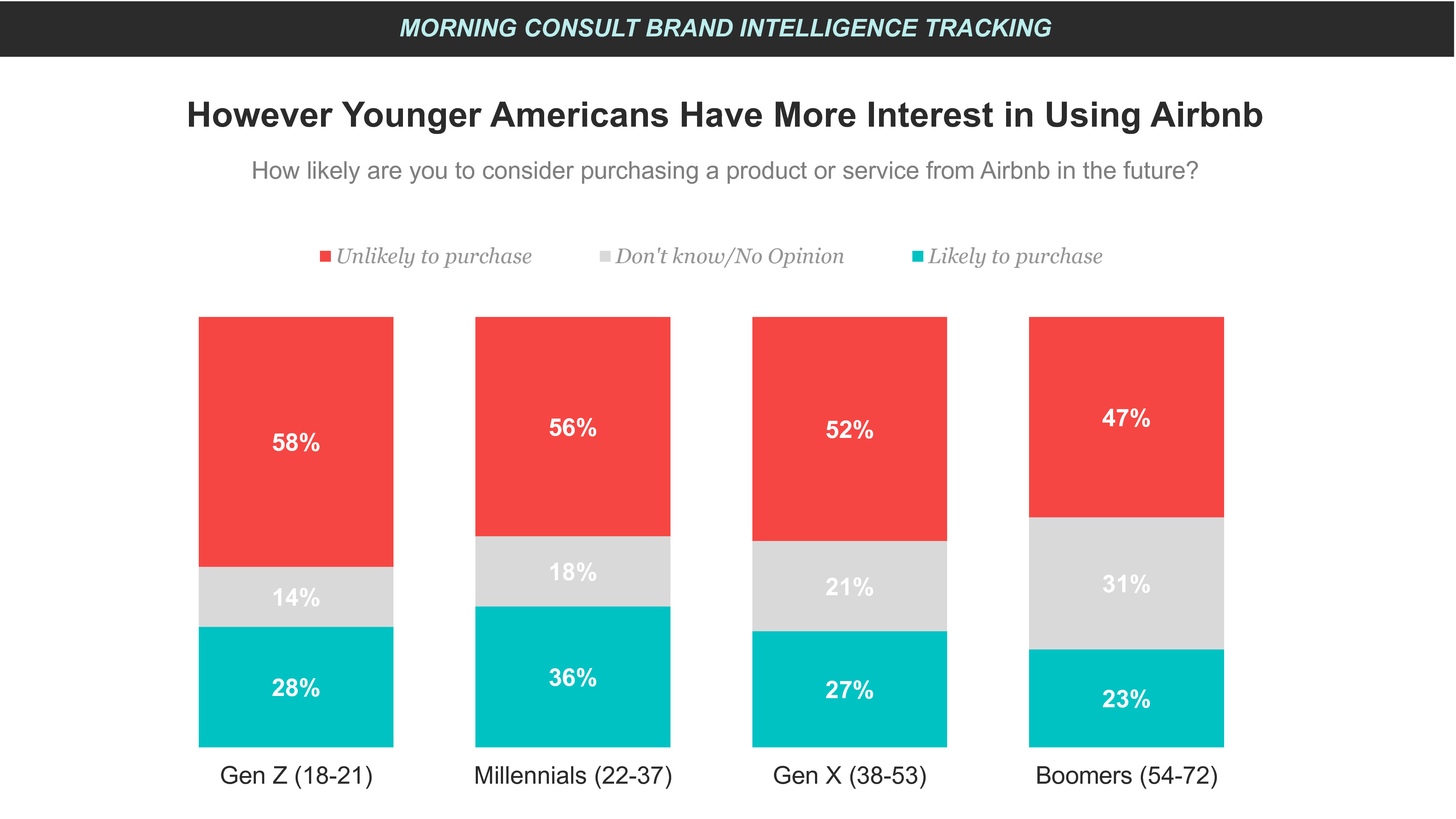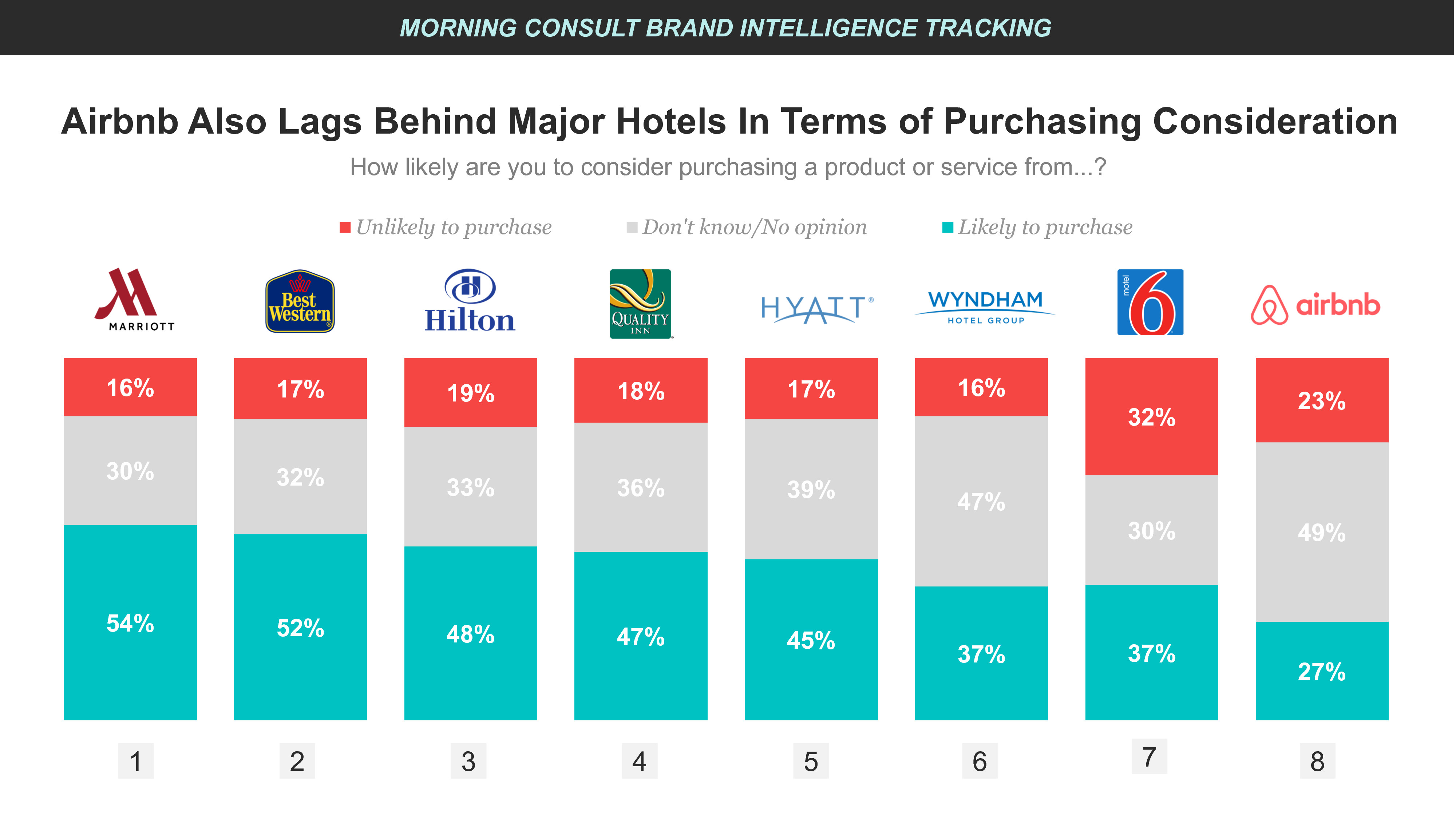 在订购意向和品牌ID方面,Airbnb落后于主要连锁酒店。但是,年轻一代的意见为共享经济的未来提示了积极信号。