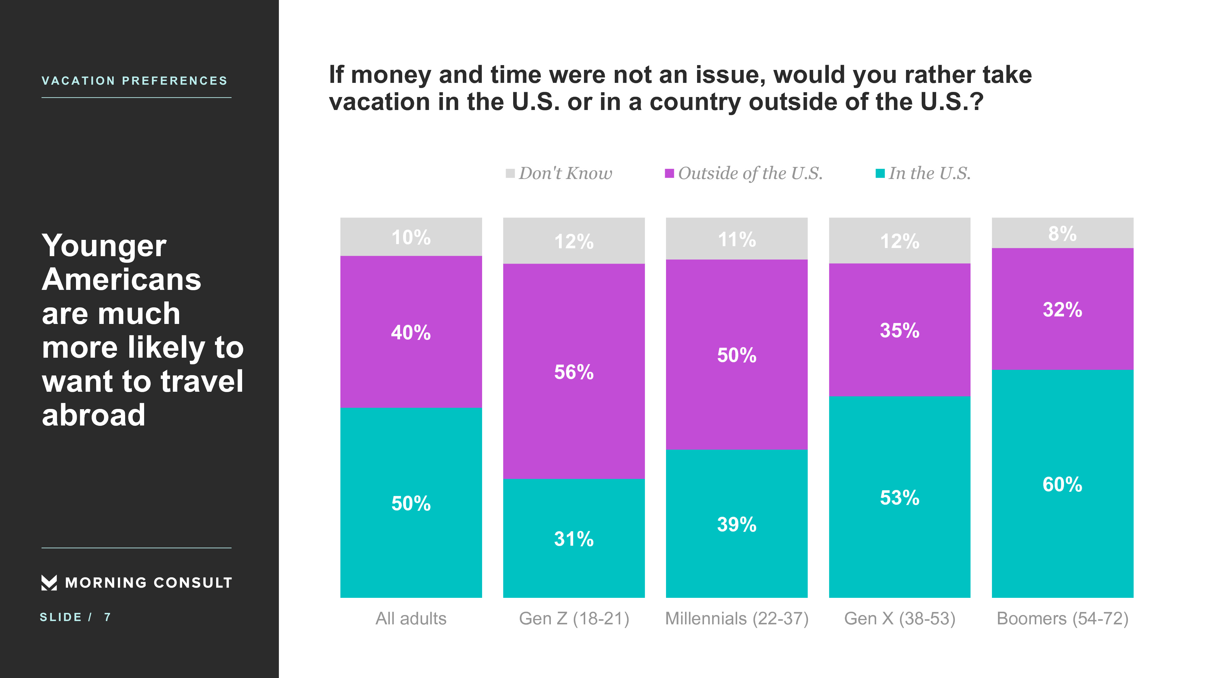 年轻一代更有可能想出国旅游,50%的千禧一代表示如果钱和时间不成问题他们更希望去外国旅游。Z世代最希望去外国旅行(56%)。X世代和婴儿潮一代更喜欢在国内旅行。从国外旅行的兴趣来看,年龄的影响很明显。