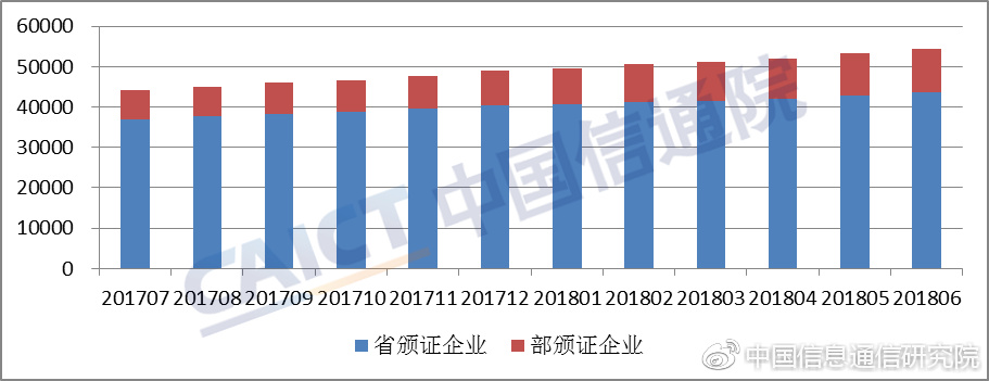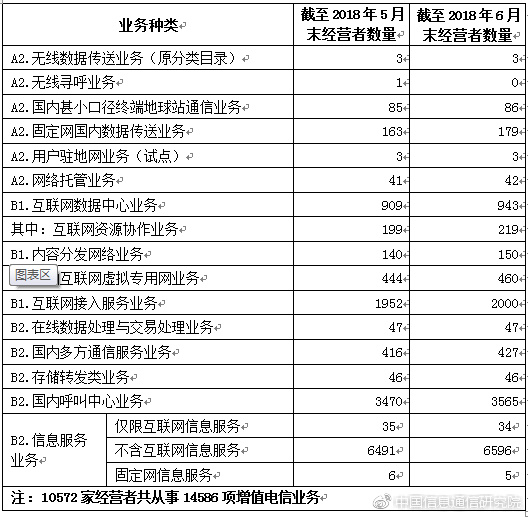 截至2018年6月底,全国增值电信业务经营许可企业共54257家,其中工业和信息化部许可的跨地区企业10572家,各省(区、市)通信管理局许可的本地企业合计43685家,较上一月分别增长1.96%、2.16%、1.91%。