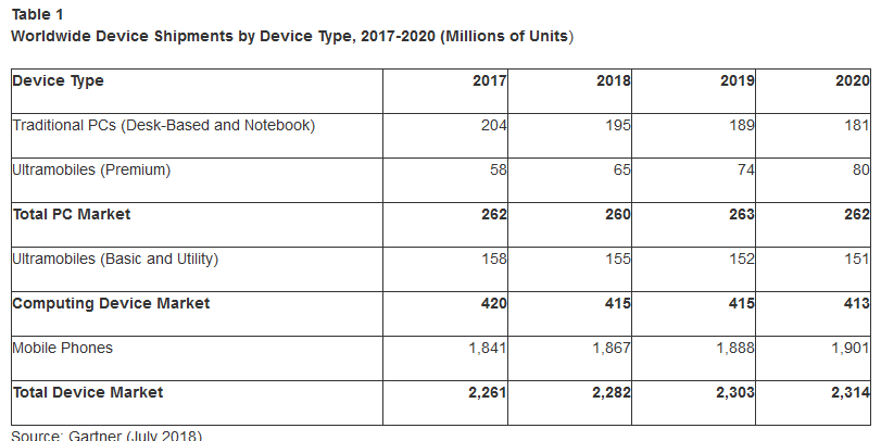 根据Gartner的数据,全球PC、平板电脑和手机出货量将在2018年增长0.9%,达到22.8亿部。PC和平板电脑市场在2018年将下降1.2%,而手机市场则在加速增长(1.4%)。Gartner估计2018年超移动设备出货量将增长12%。